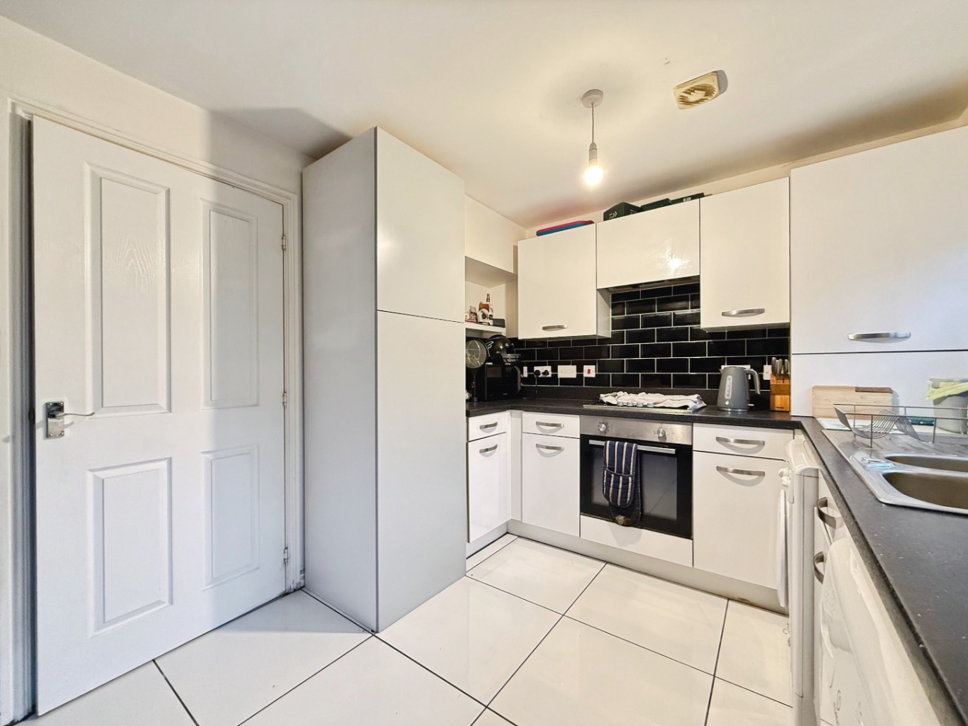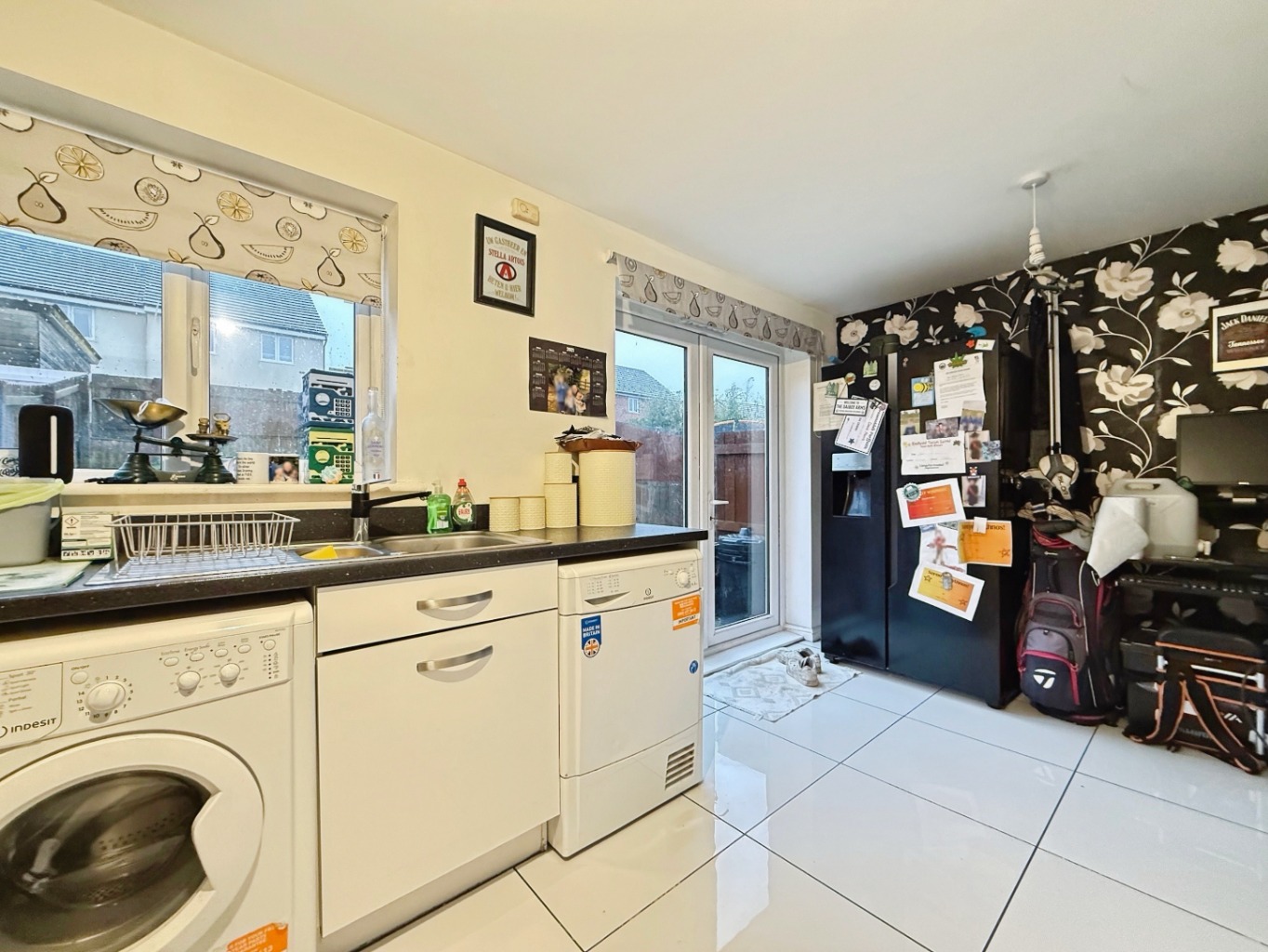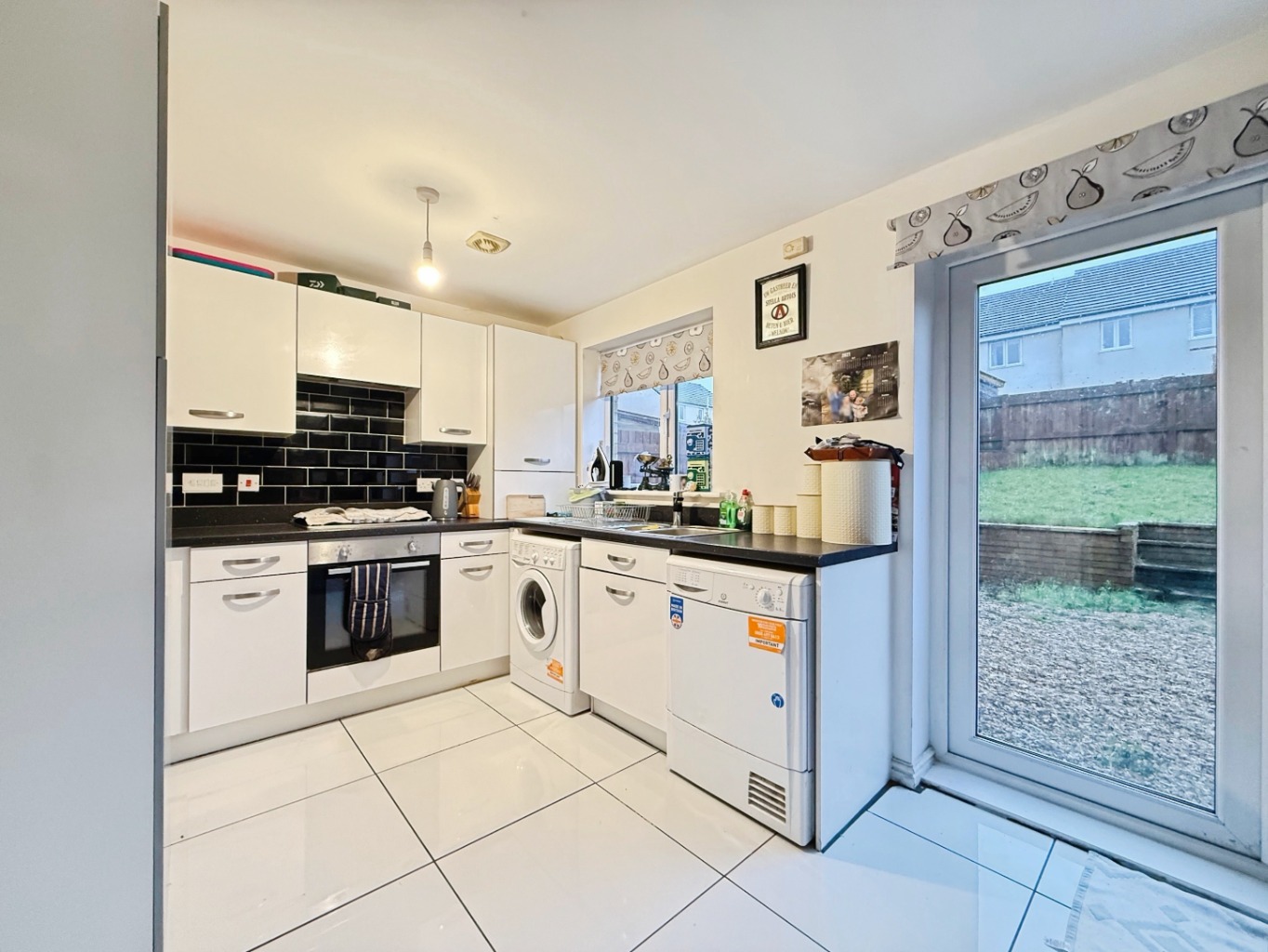 Fitted with a range of matching wall and base units in white gloss with complimentary work surface over, 1 1/2 bowl stainless steel sink with mixer tap, integrated gas hob with extractor over, electric oven, space for washing machine, space for fridge/freezer, high gloss tiled flooring, tiled splashback, radiator, cupboard housing wall mounted gas combination boiler., uPVC double glazed window to rear elevation, uPVC double glazed patio doors to rear elevation.