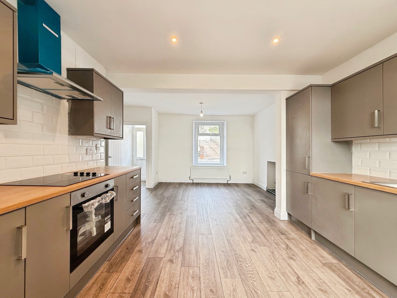 Fitted with a modern range of matching wall and base units with complimentary work surface over, 1 1/2 bowl stainless steel sink with mixer tap, induction hob with extractor over and oven under, space for freestanding fridge/freezer and washing machine, tiled splashback, radiator x2, laminate flooring underfoot, uPVC double glazed window to front and rear elevation, steps down to lower ground floor.