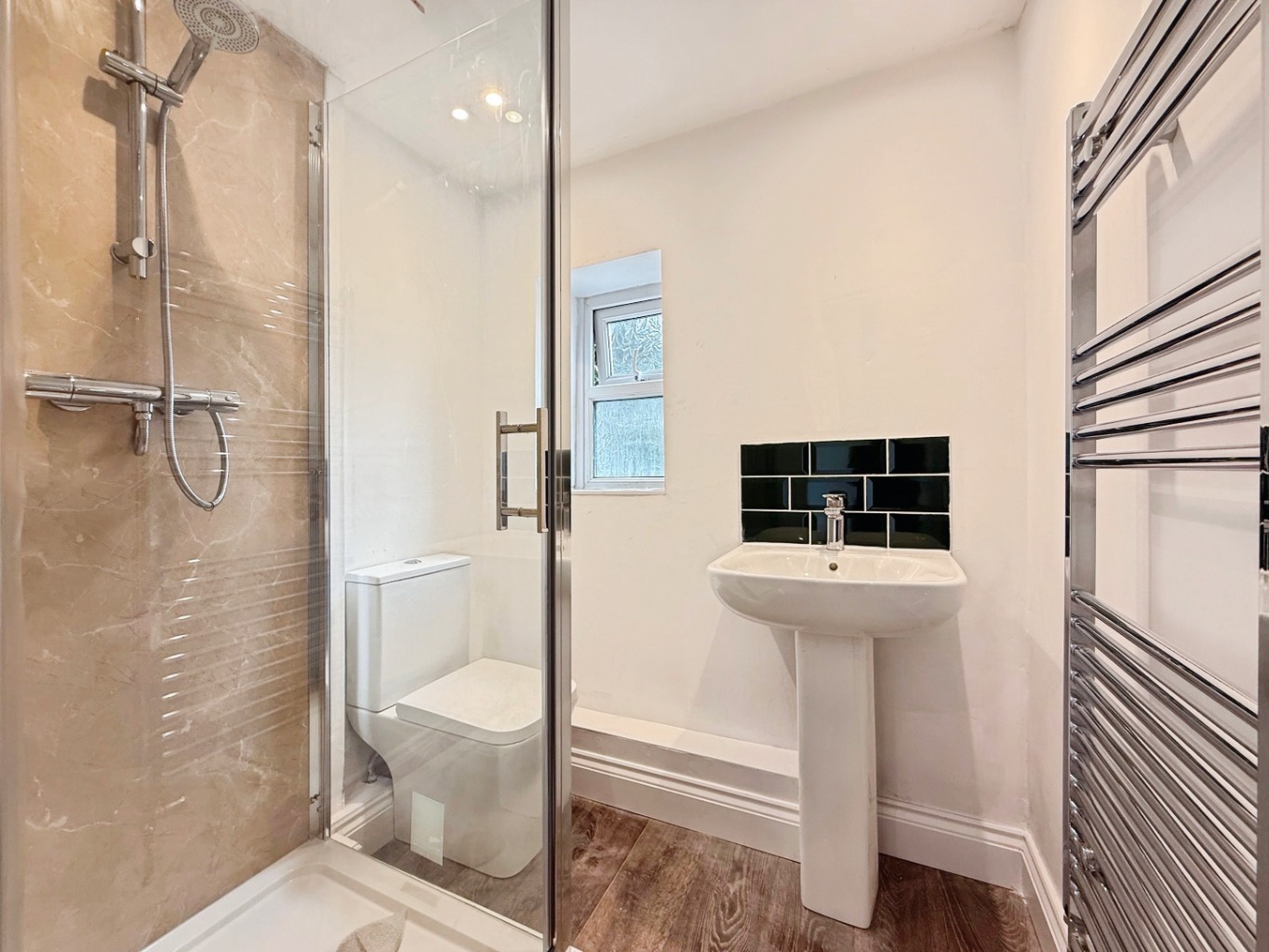 Fitted with a white three piece suite comprising of W/C, pedestal wash hand basin, polished chrome heated towel rail, shower enclosure, uPVC double glazed frosted window to front elevation, storage cupboard.