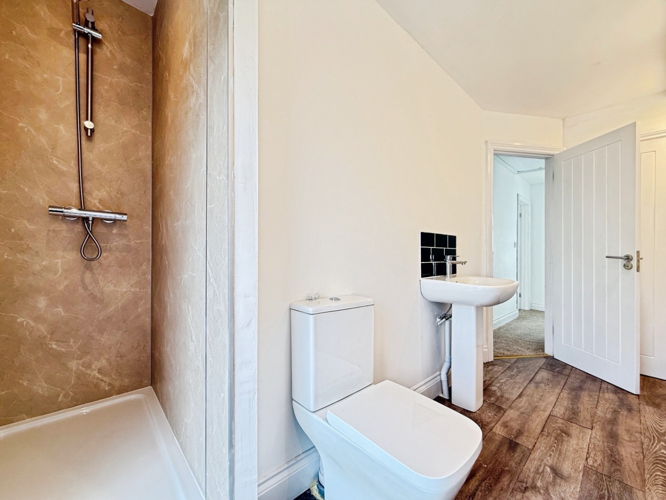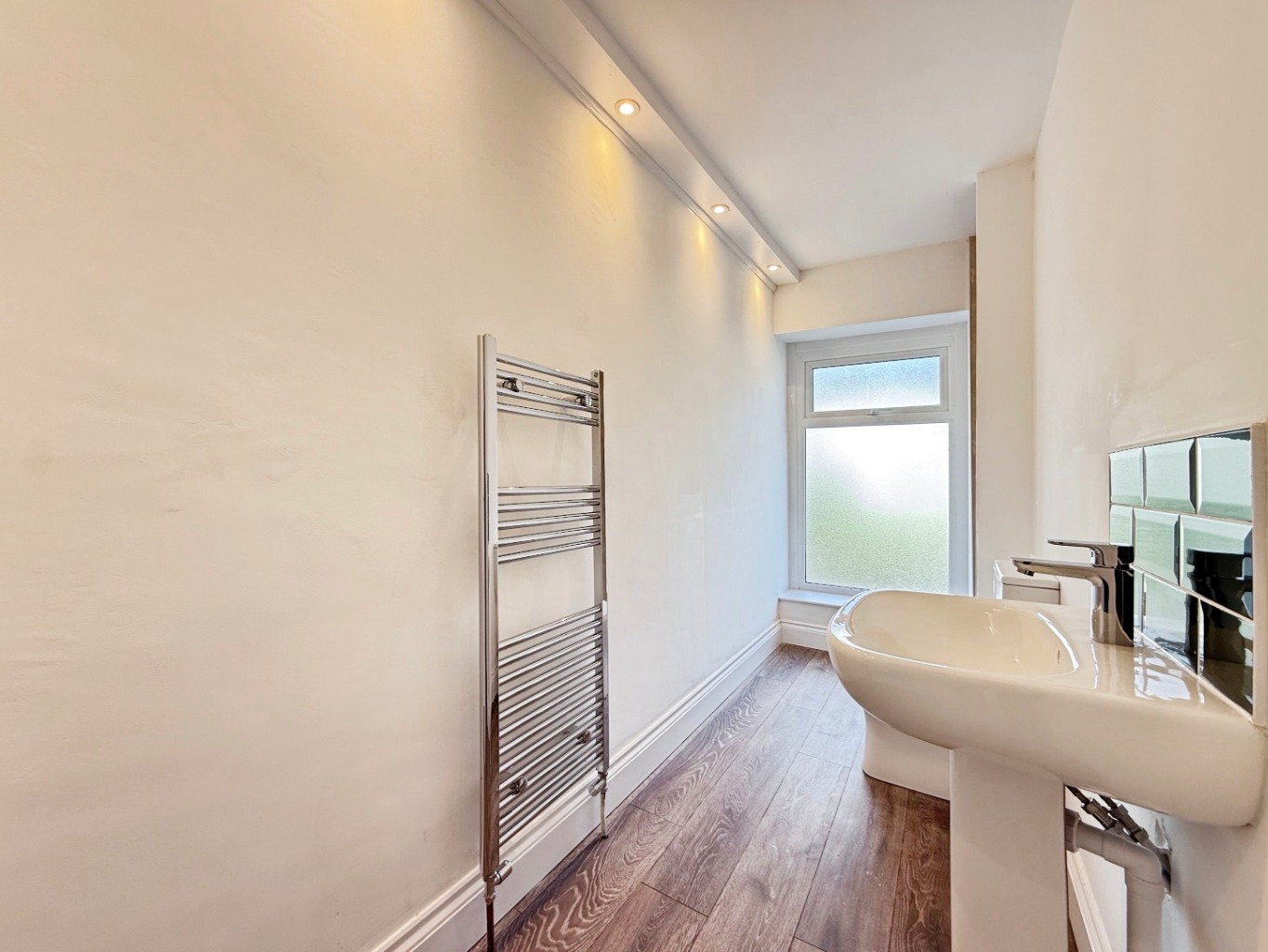 Fitted with a white three piece suite comprising of W/C, pedestal wash hand basin, shower enclosure, polished chrome towel rail, uPVC double glazed frosted window to rear elevation.