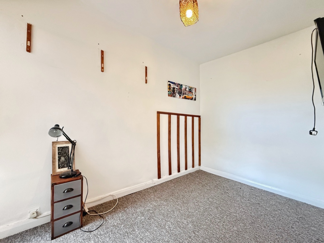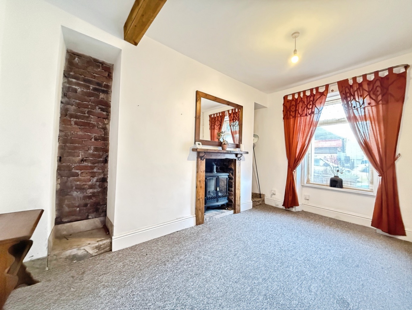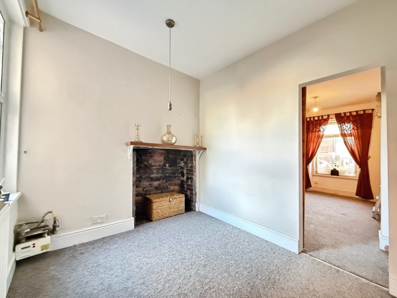 Carpeted underfoot, uPVC double glazed window to the front elevation, glazed wooden internal door, exposed fireplace housing electric fire, wooden fire surround with tiled hearth, separated by plasterboard wall with barn style sliding door into: