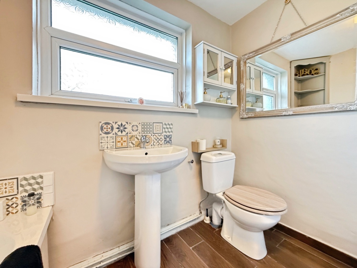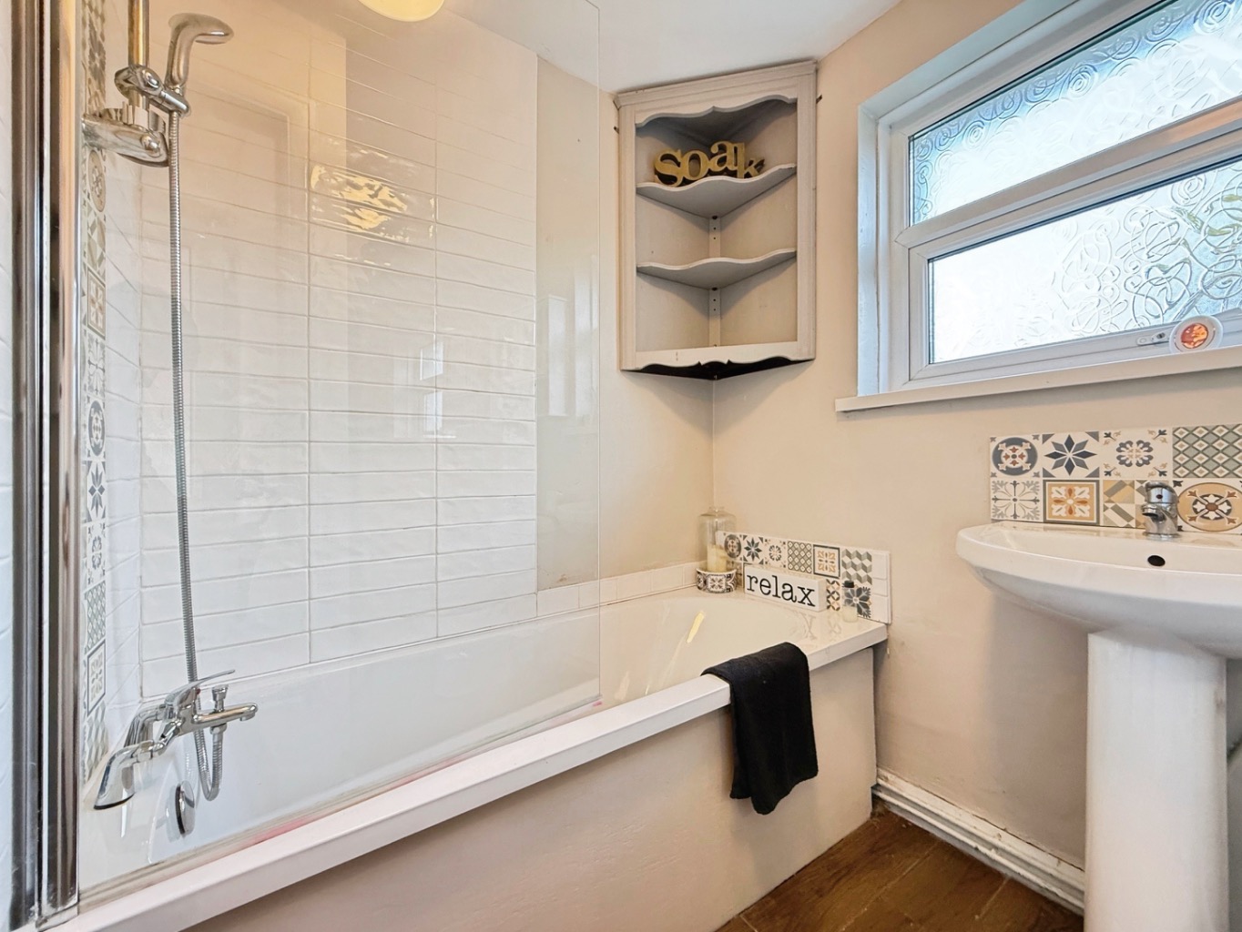 Fitted with a white three piece suite comprising of W/C, pedestal wash hand basin with tiled splashback, panelled bath with glass modesty screen and overhead shower, space and plumbing for washing machine and tumble dryer, tiled flooring, partly tiled walls, uPVC double glazed frosted window to rear elevation, radiator.