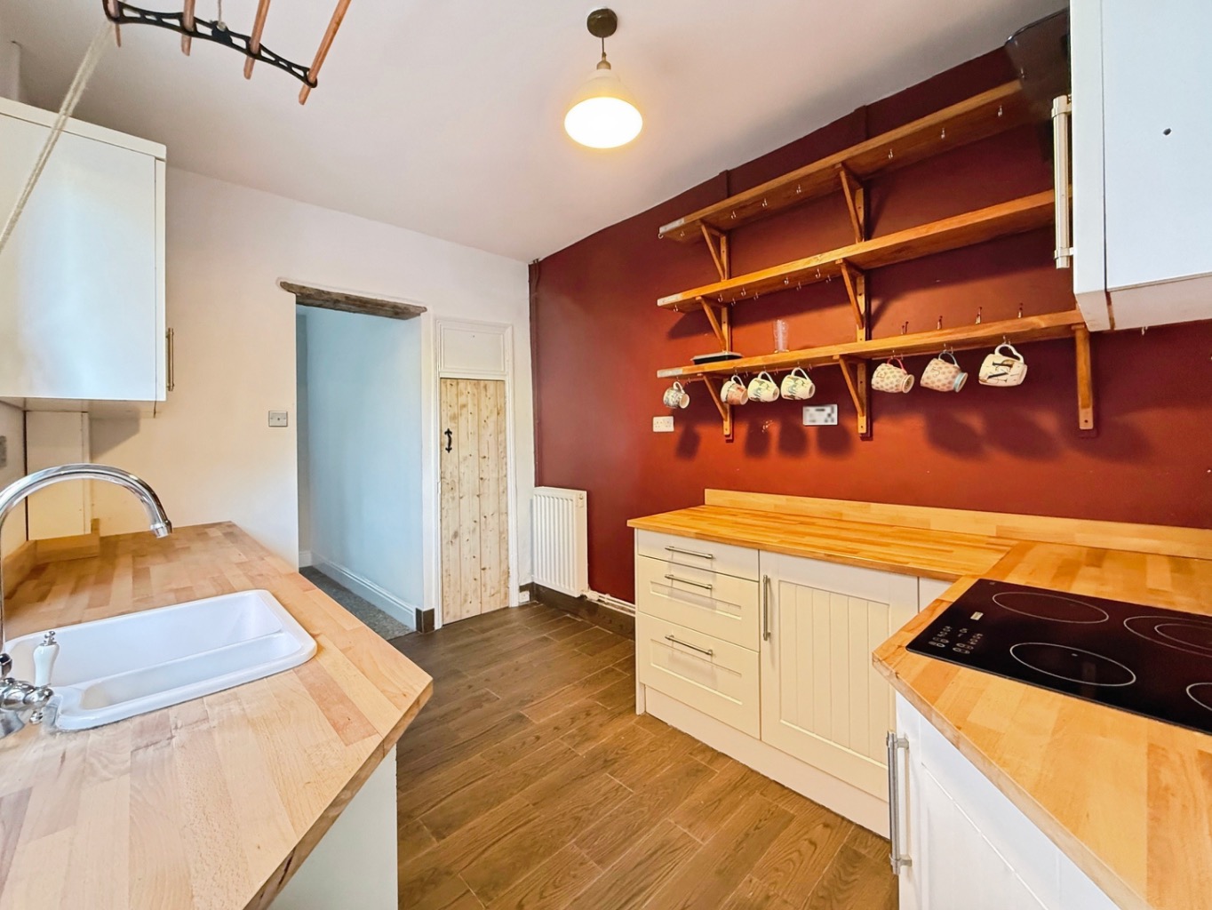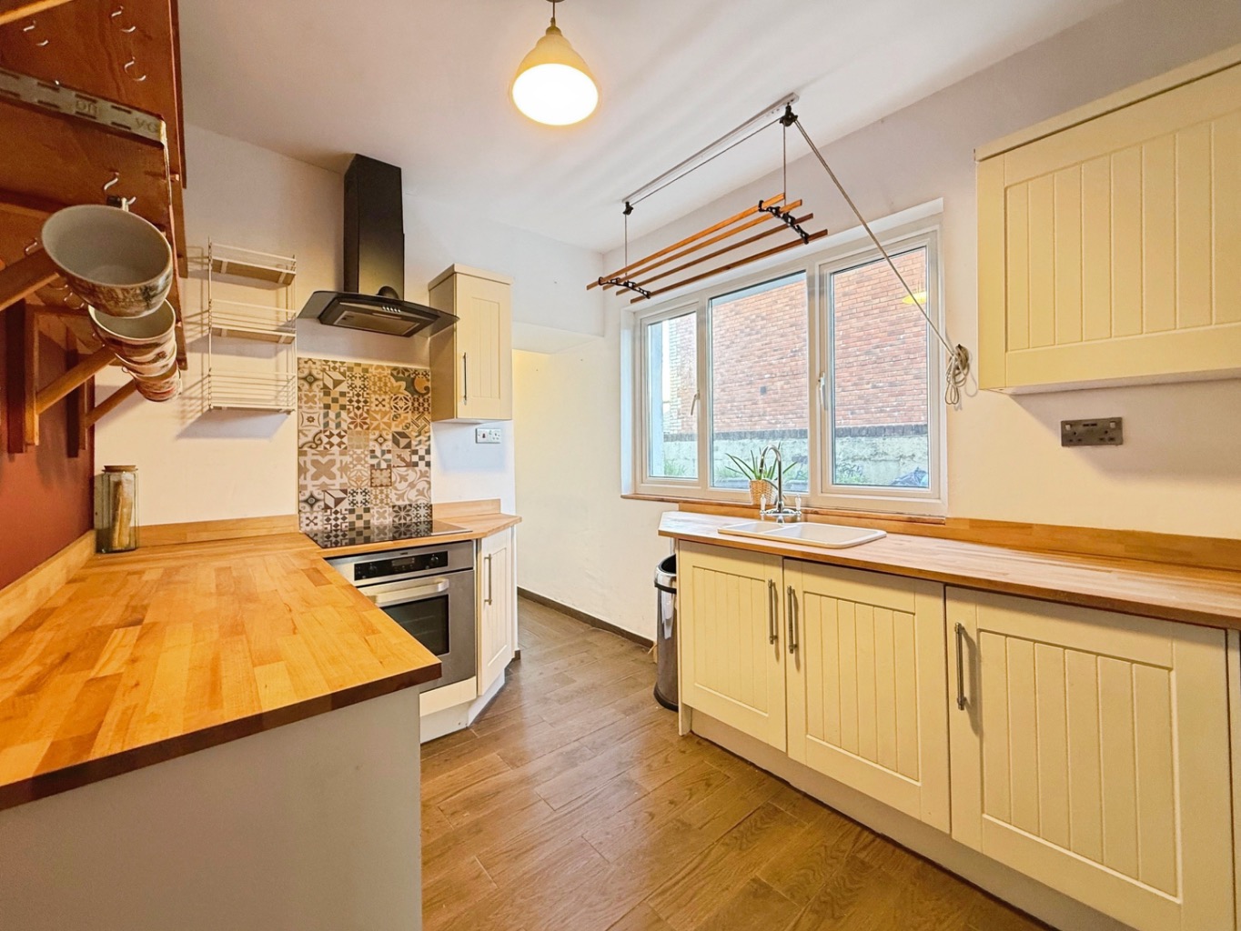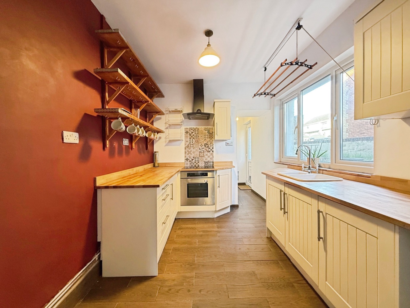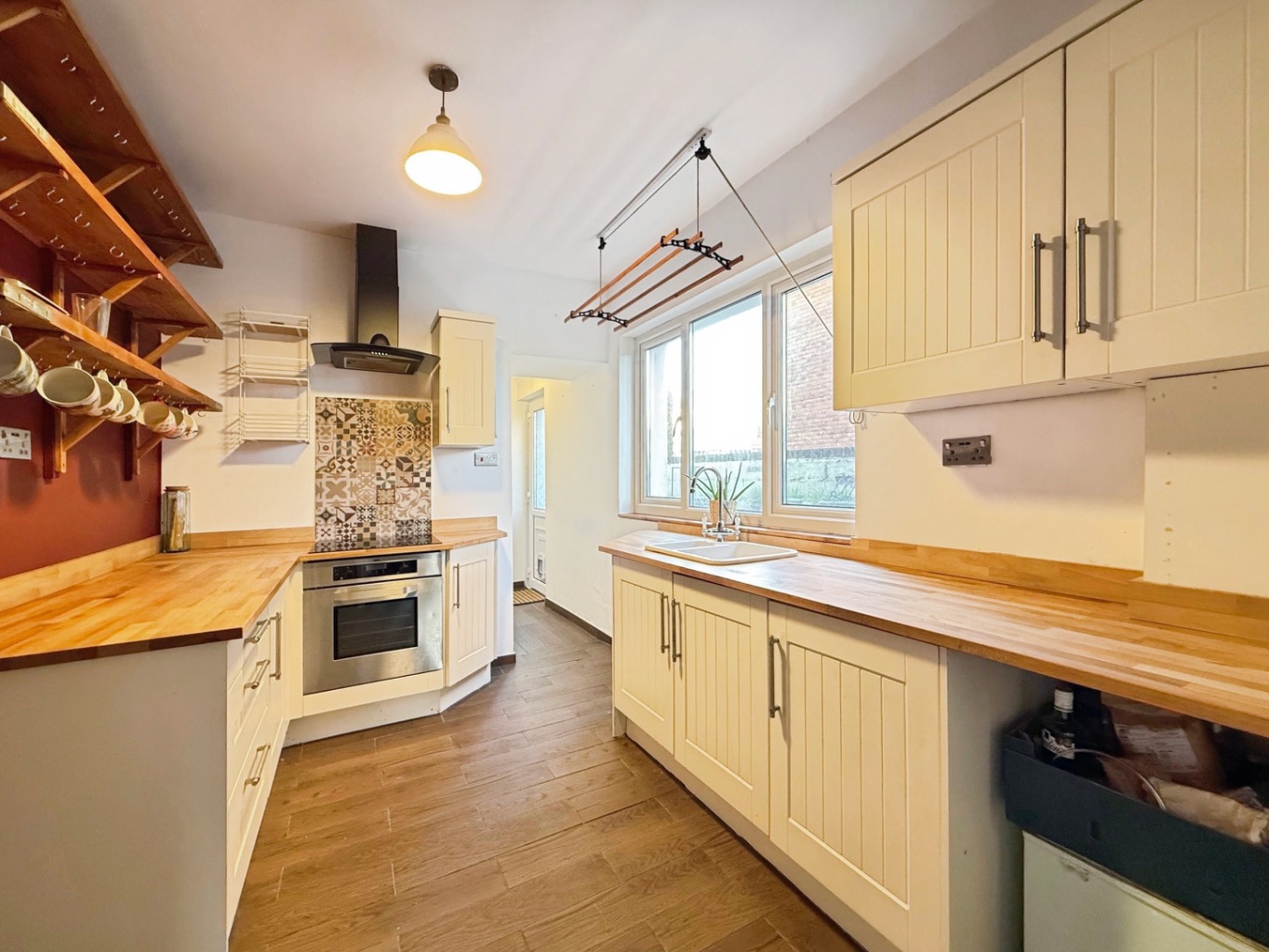 Fitted with a range of shaker style wall and base units with solid wood worktops, ceramic sink unit with mixer tap, integrated stainless steel electric oven with electric hob above and extractor over, plumbing for dishwasher, space for fridge/freezer, tiled flooring, radiator, uPVC double glazed window to side elevation, pantry with shelving, uPVC double glazed door to garden, door into: