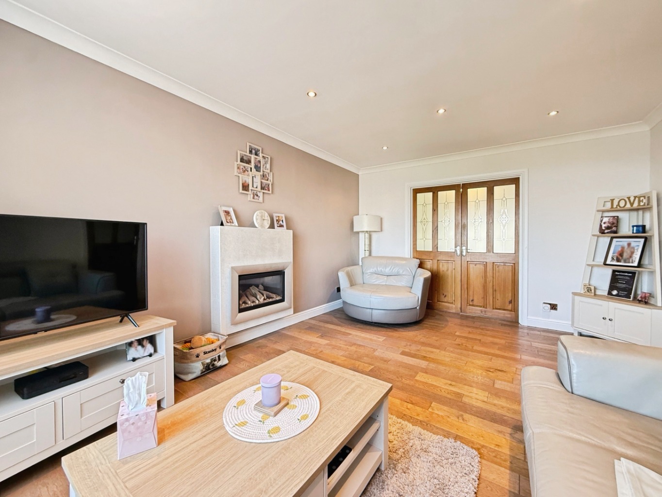 Wooden style flooring underfoot, uPVC double glazed window to front elevation with stunning open aspect viewing of Swansea Bay & The Mumbles, decorative fireplace, ceiling coving, spotlights to ceiling, radiator, double doors into: