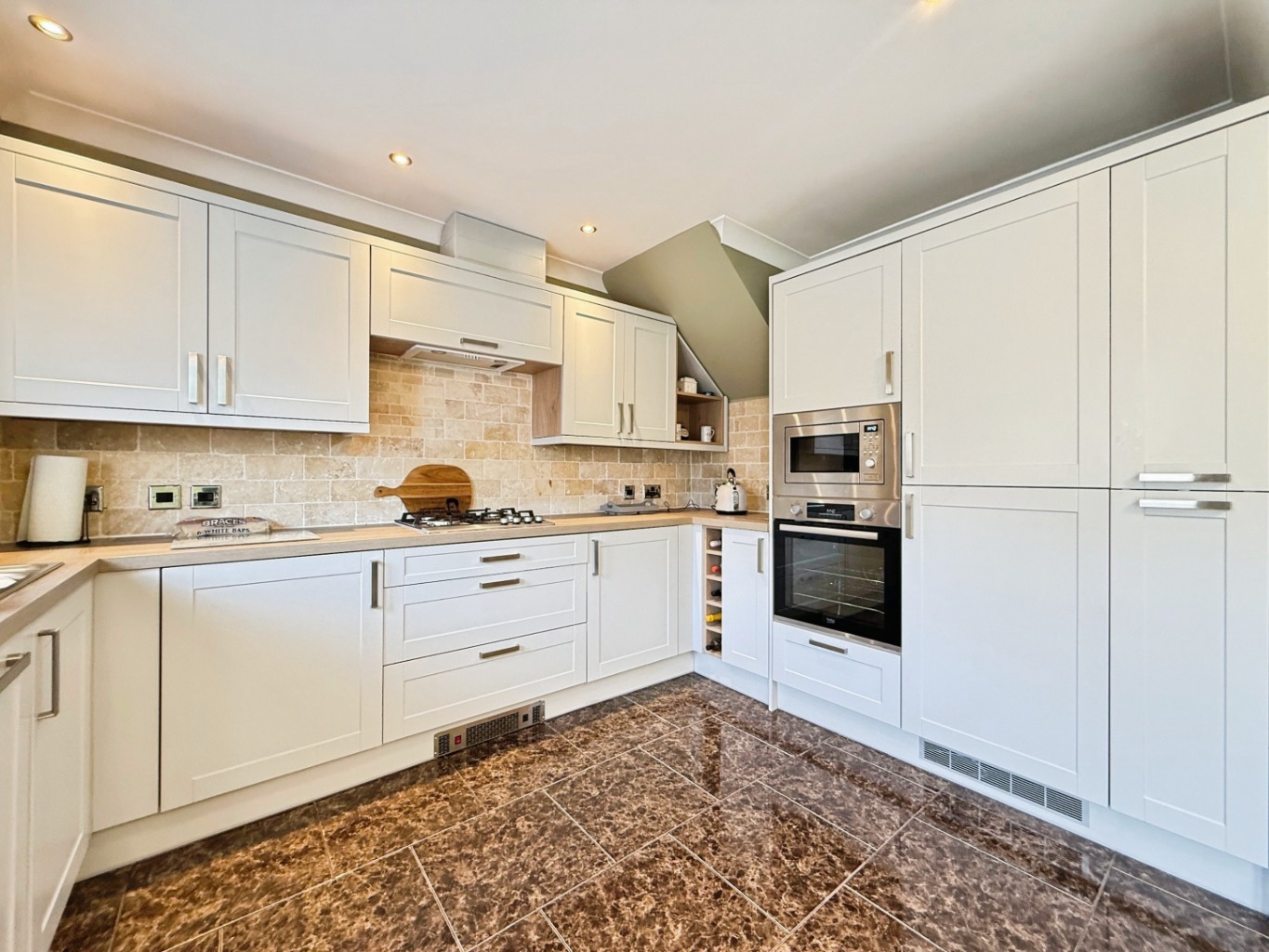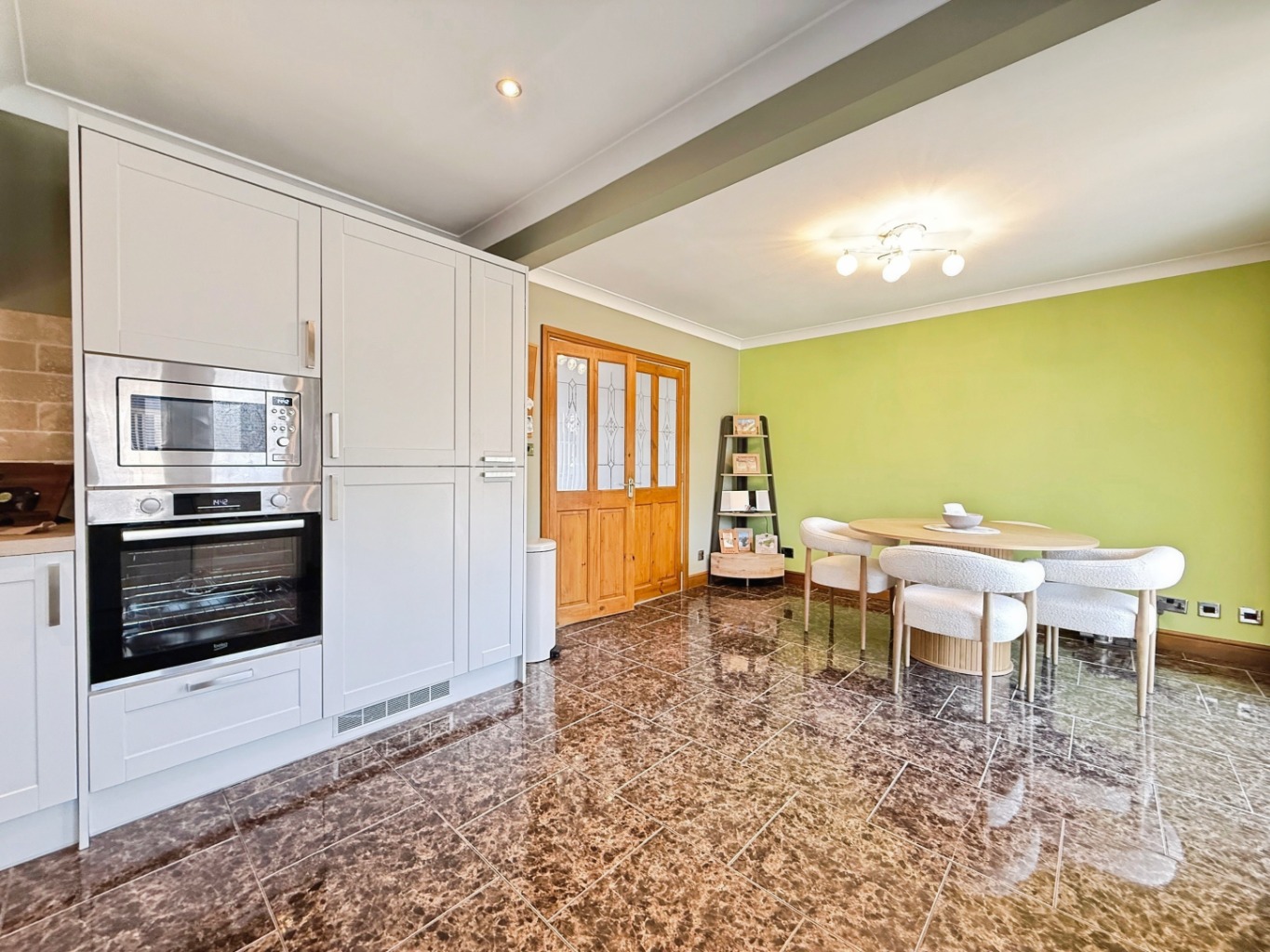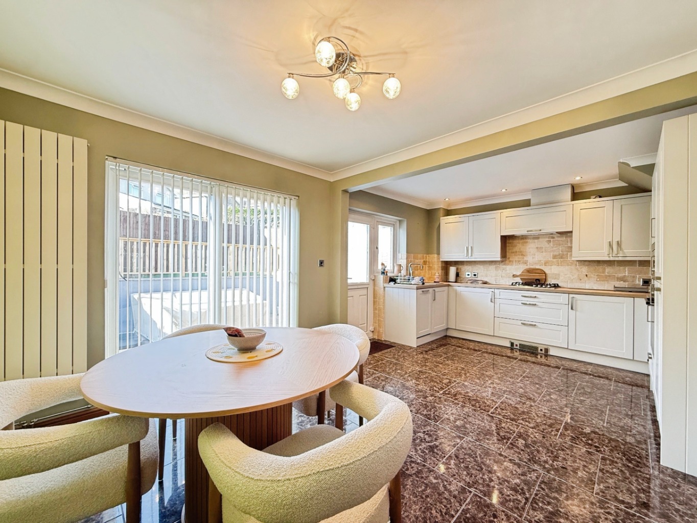 Fitted with a modern range of wall and base units with complimentary work surface over, inset stainless steel sink with mixer tap, four ring gas hob with concealed extractor above, integrated fridge/freezer, integrated eye level microwave and oven under, wine rack, pull out larder style unit, integrated slimline dishwasher, spotlights to ceiling, coving to ceiling, tiled flooring, vertical radiator, uPVC double glazed window to rear elevation, uPVC double glazed sliding doors to rear elevation. NEW GAS COMBI BOILER DECEMBER 2025.