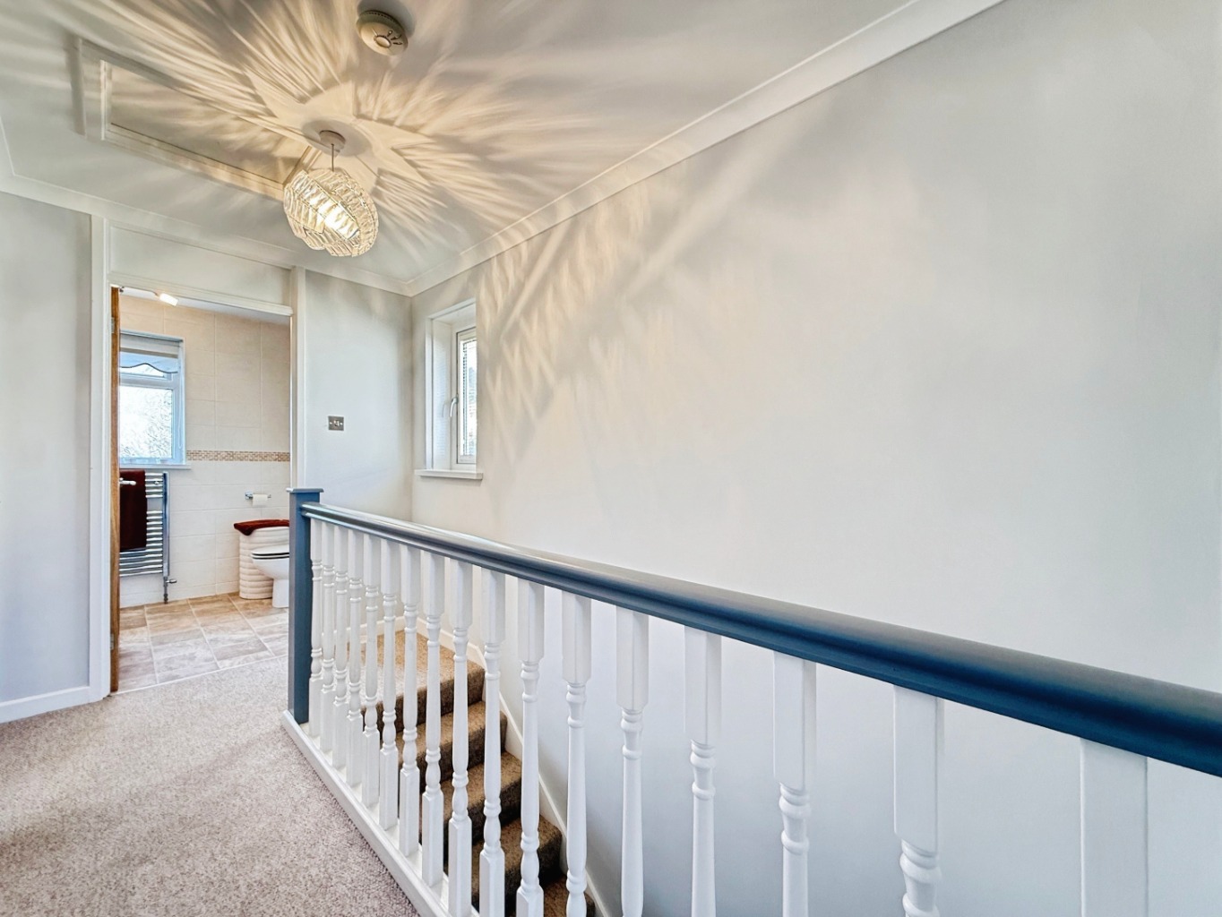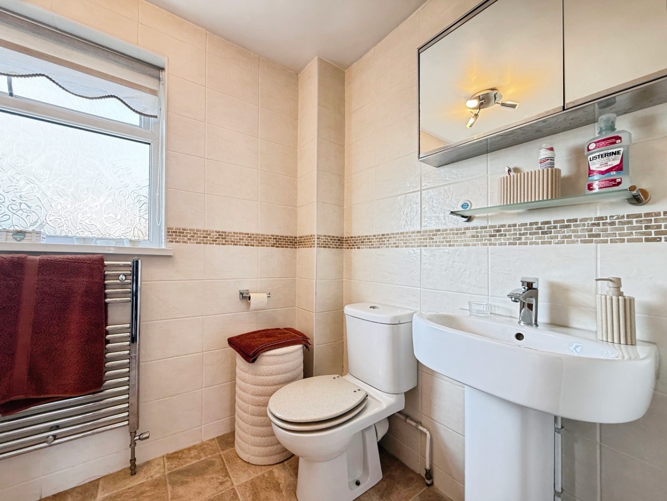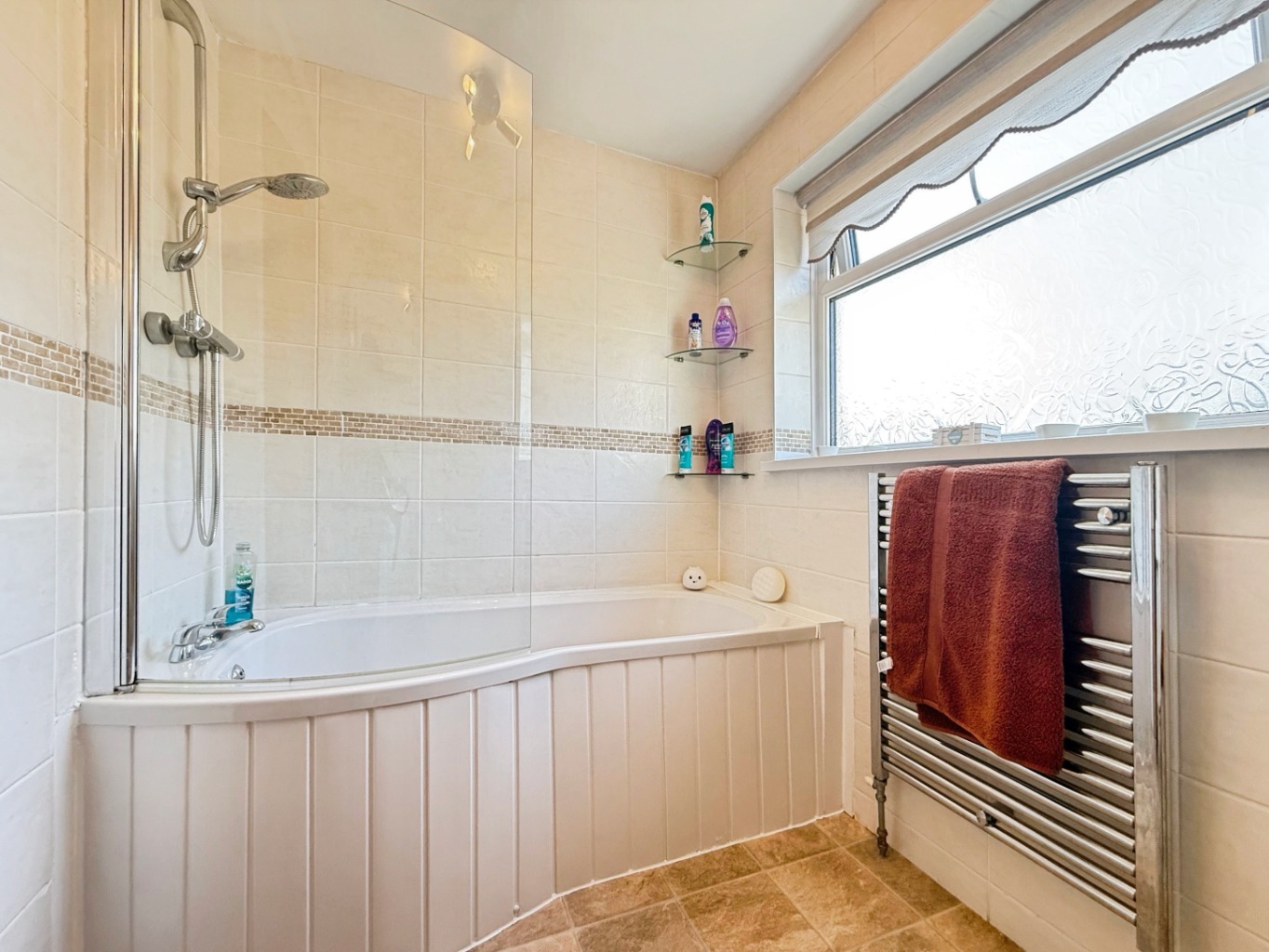 Fitted with a white three piece suite comprising of W/C, pedestal wash hand basin, panelled bath with shower overhead and glass modesty screen, fully tiled walls, polished chrome heated towel rail, uPVC double glazed frosted window to rear elevation.