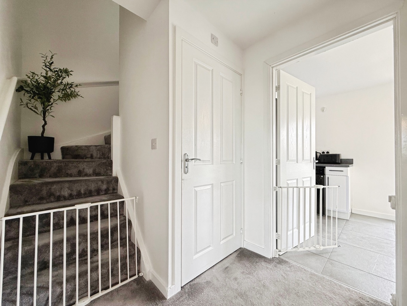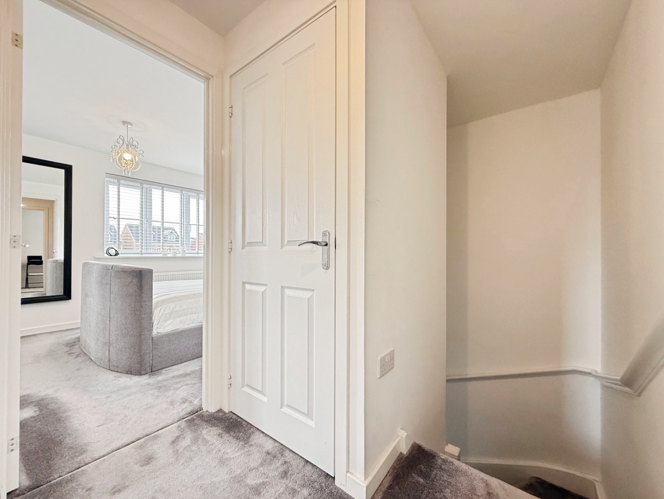 Carpeted stairs to first floor, carpeted underfoot, doors into: