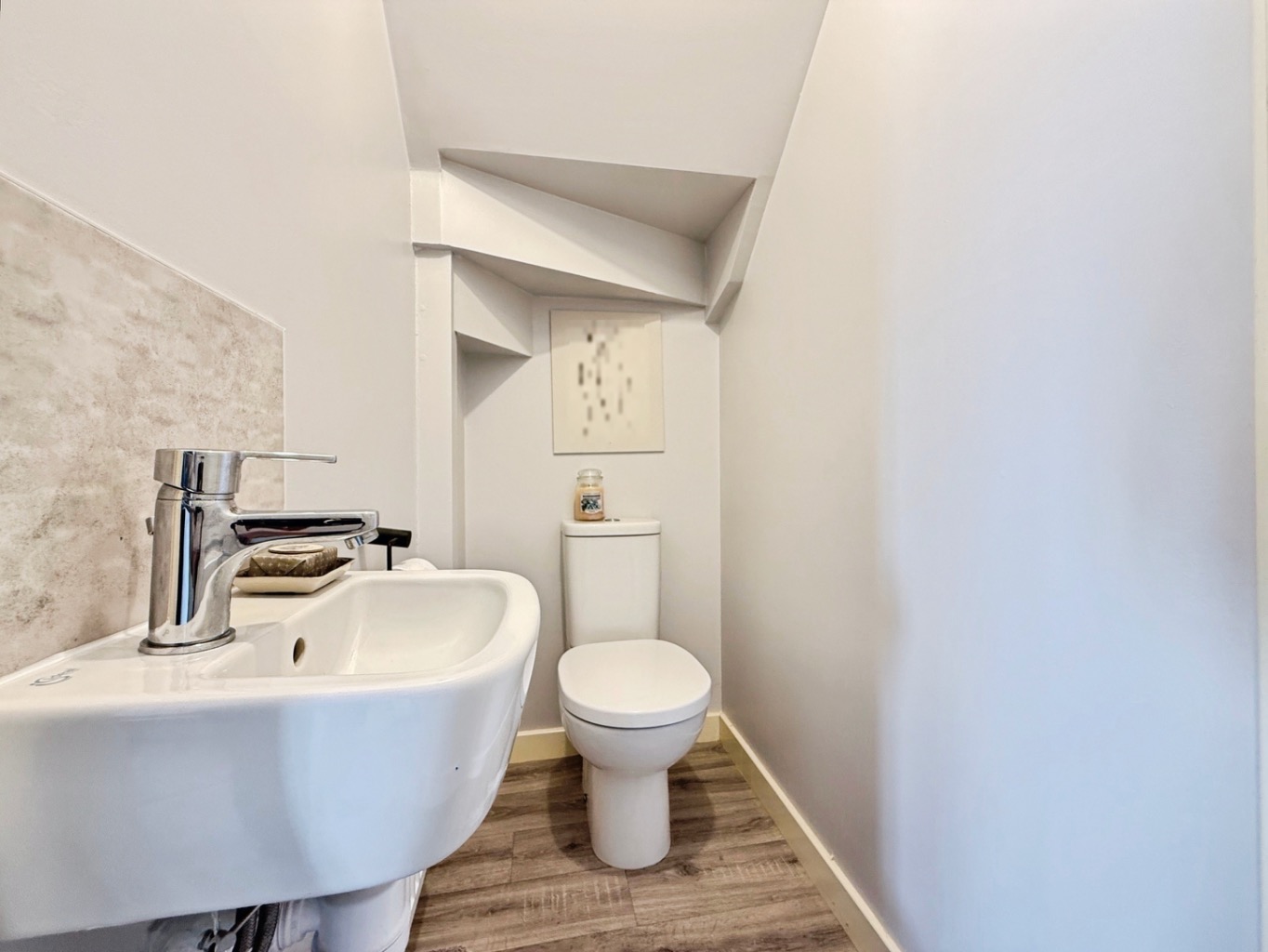 Modern white two piece suite comprising low level W/C and wall mounted wash hand basin with splash back tiling, radiator, wood effect flooring.