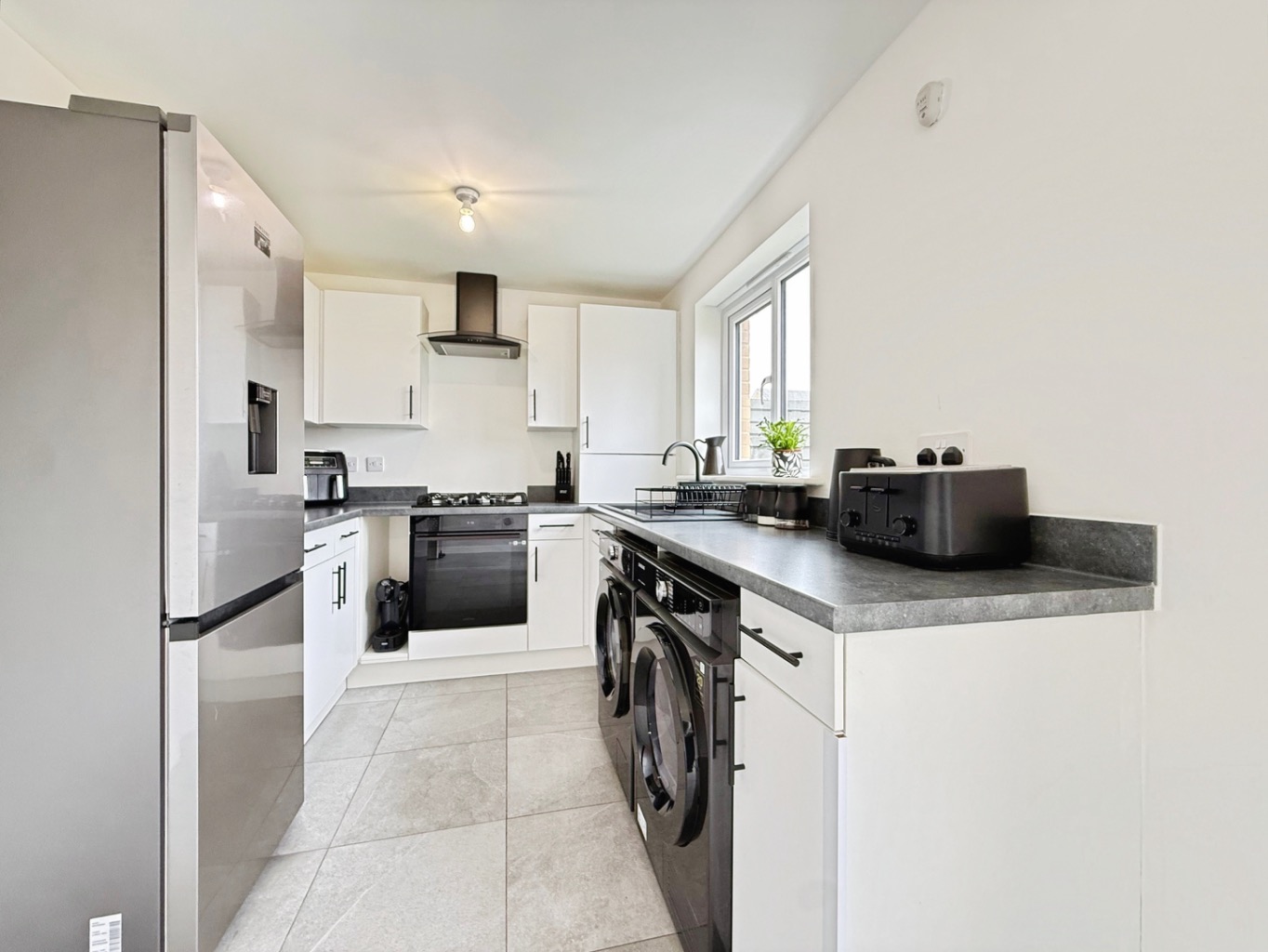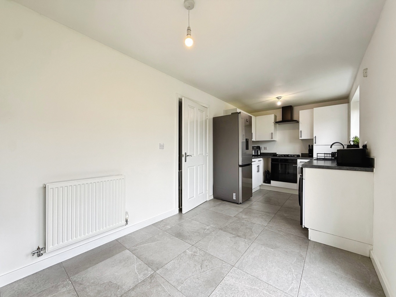 Fitted with a range of white wall, base and drawer units with work surface over incorporating stainless steel sink unit with mixer tap, integrated 'SAMSUNG' oven with four ring gas hob and extractor fan over, plumbed for washing machine and space for tumble dryer, space for fridge/freezer, uPVC double glazed window and patio doors to rear, tiled flooring, radiator.