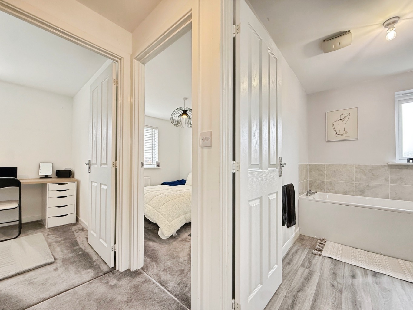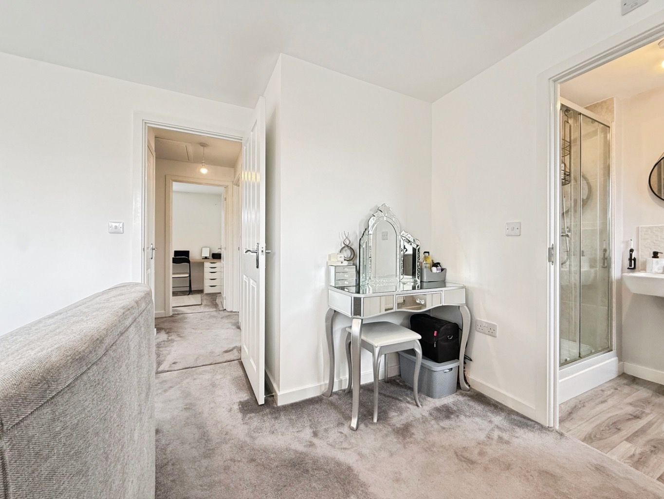 Upstairs, the spacious master bedroom benefits from an en suite shower room, while two further well-proportioned bedrooms are served by a contemporary family bathroom.