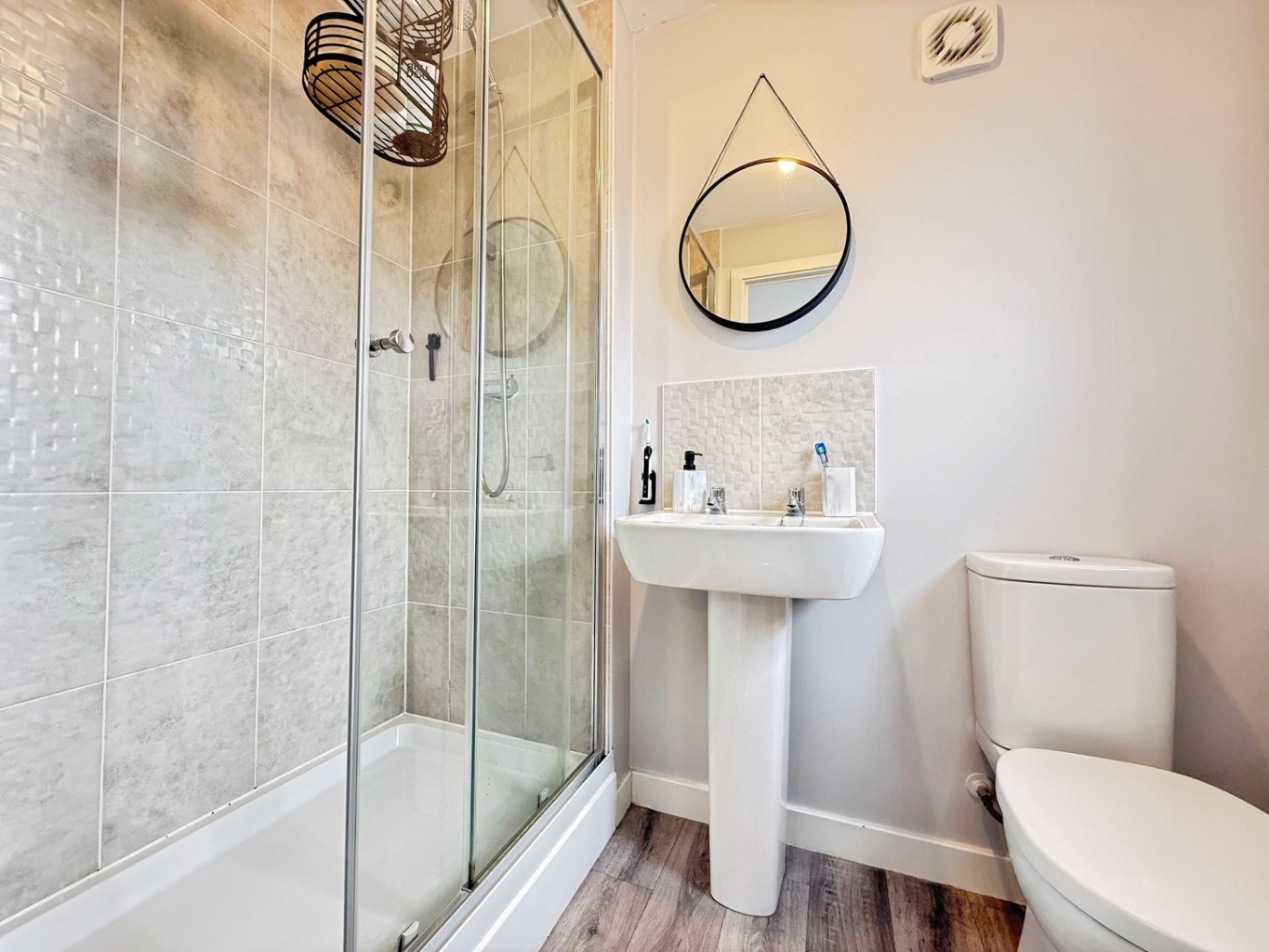 Modern suite comprising low level W/C, pedestal wash hand basin with splash back tiling and fully tiled double shower enclosure, radiator, uPVC double glazed frosted window to front elevation.