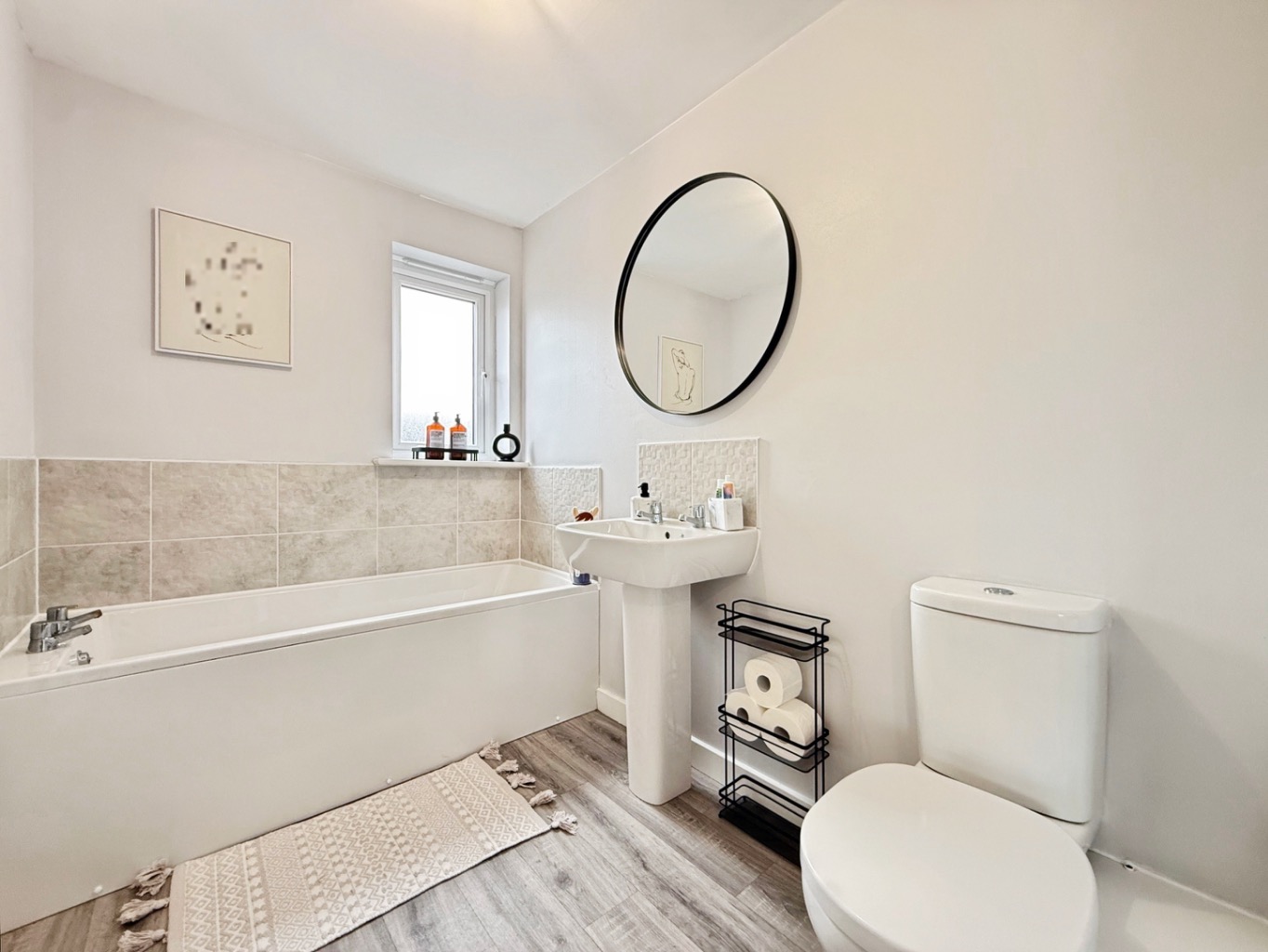 Modern white three piece suite comprising low level W/C, pedestal wash hand basin and bath, splash back tiling, radiator uPVC double glazed frosted window to side elevation.