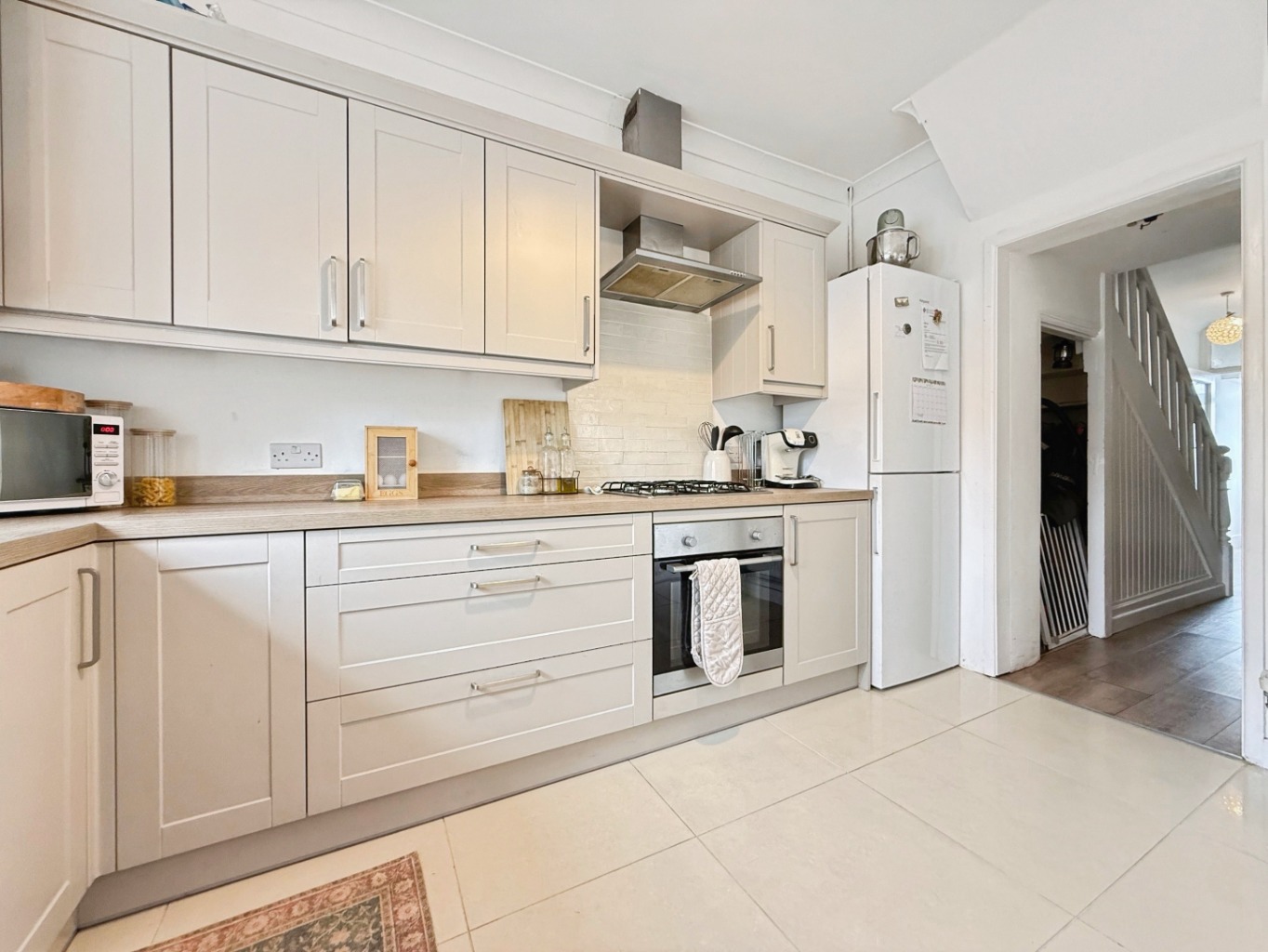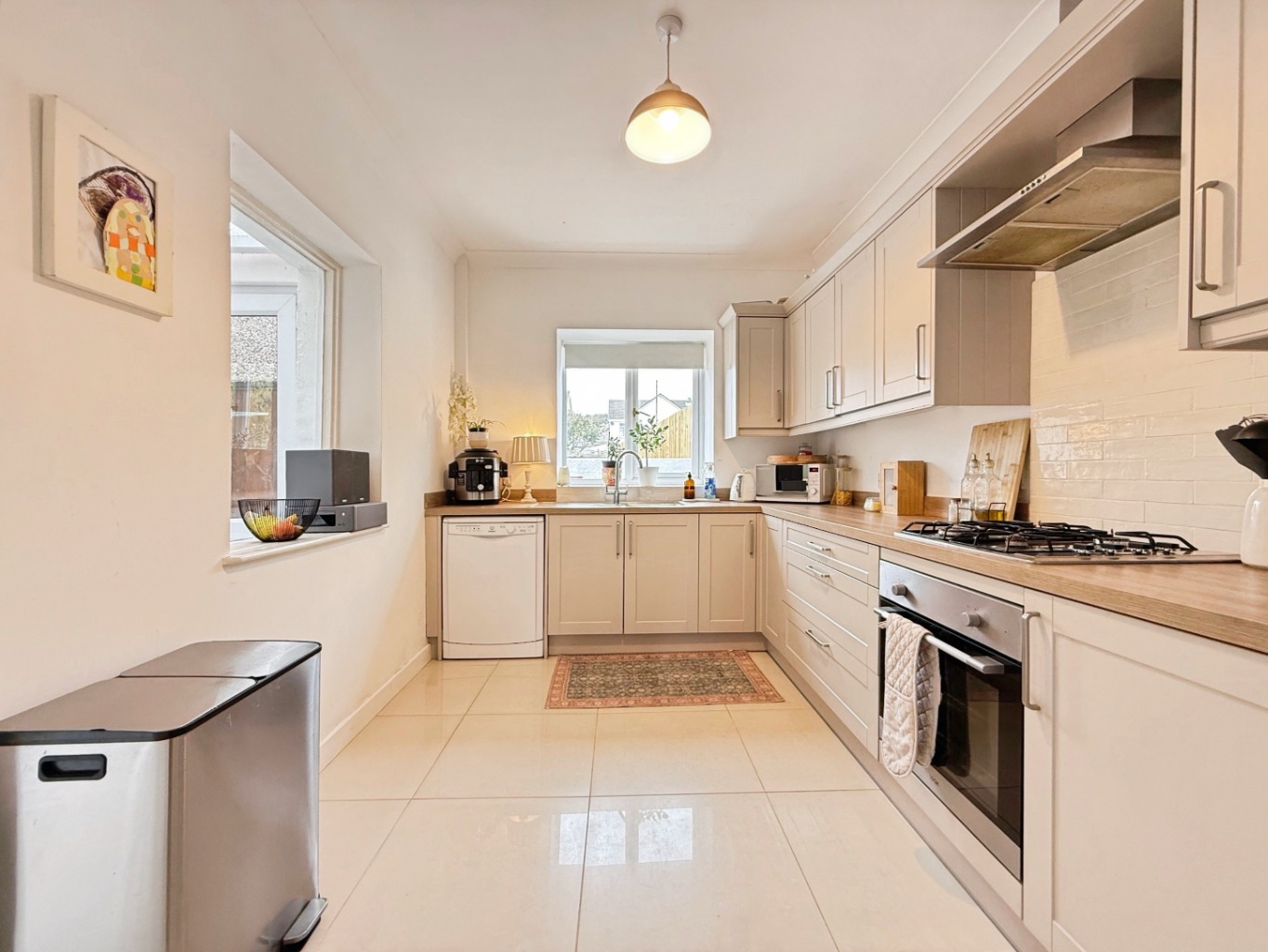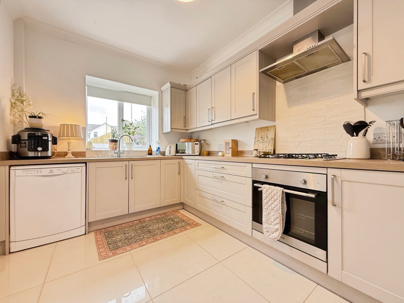 Fitted with a range of matching wall and base units with complimentary work surface over, four ring gas hob, oven under with extractor over, 1 1/2 stainless steel sink with mixer tap, space for freestanding fridge/freezer, space for freestanding dishwasher, uPVC double glazed window to rear elevation, high gloss tiled flooring, radiator, space for breakfast table, door into: