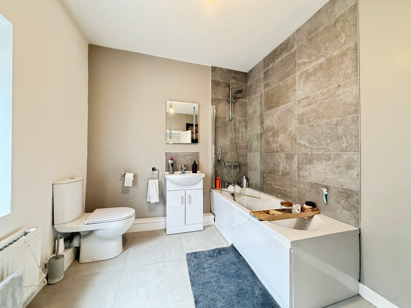 Fitted with a white three piece suite comprising of W/C, sink set in vanity unit, paneled bath with shower over head and glass modesty screen, tiled flooring, partly tiled walls, uPVC double glazed frosted window to side elevation, airing cupboard housing gas combination boiler, radiator.