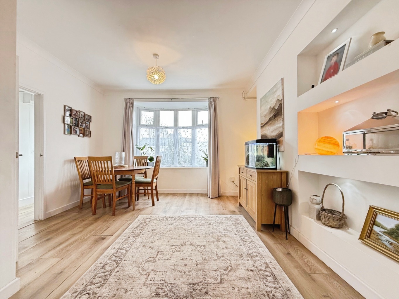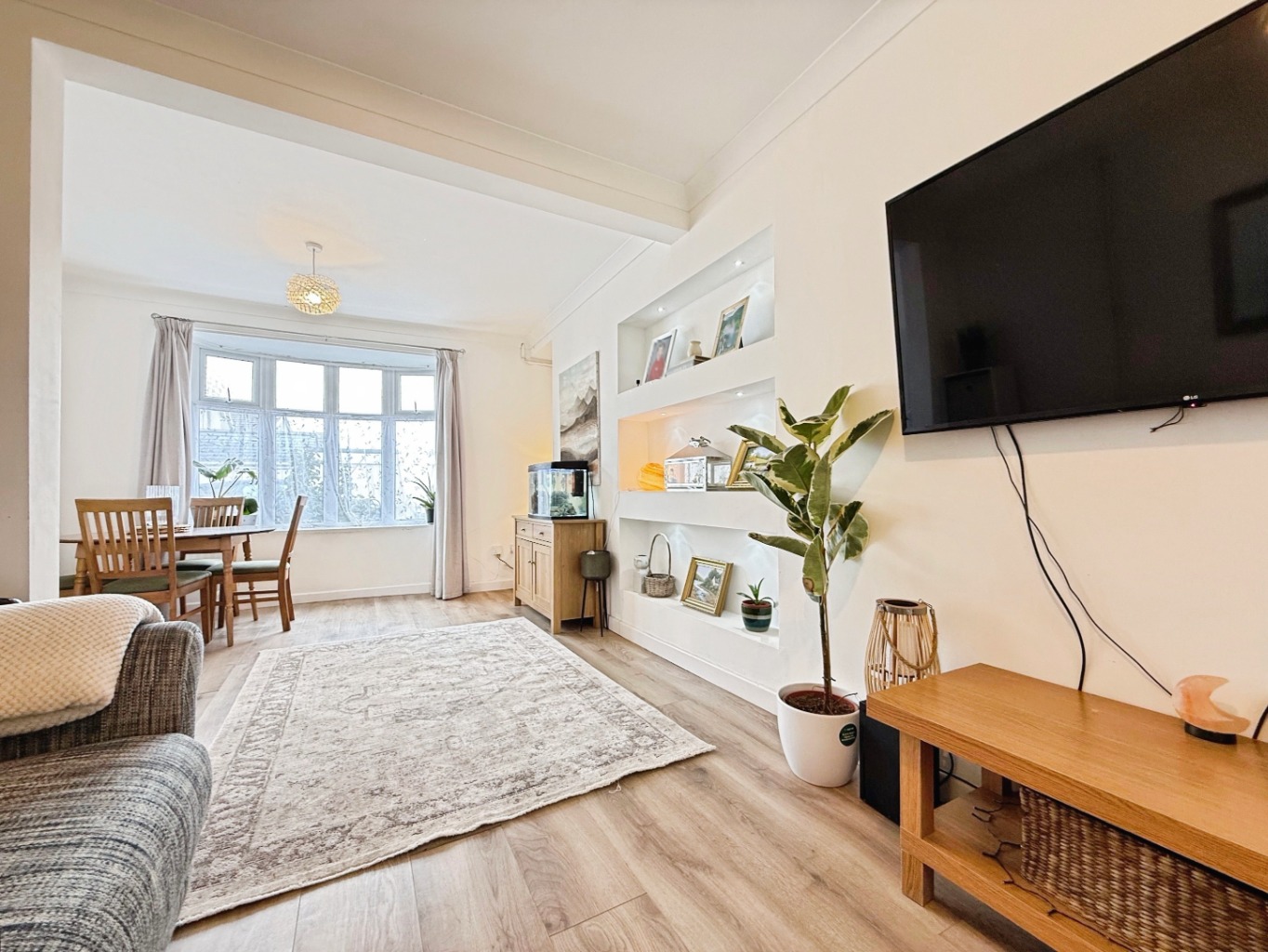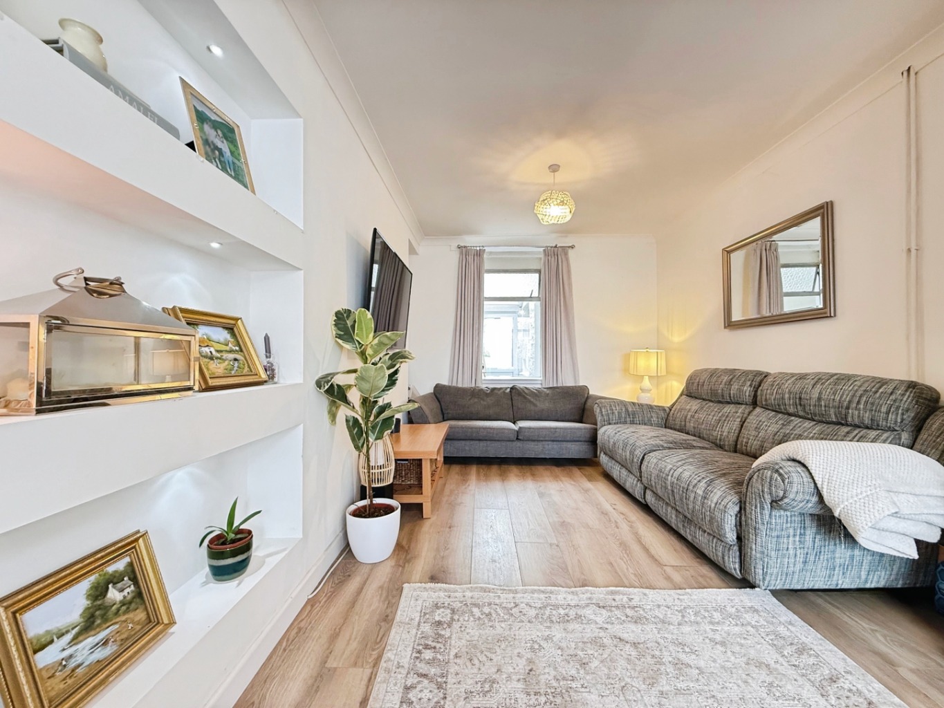 Laminate flooring, uPVC double glazed window to front elevation, radiator x2, recess wall display with spotlights, coving to ceiling.