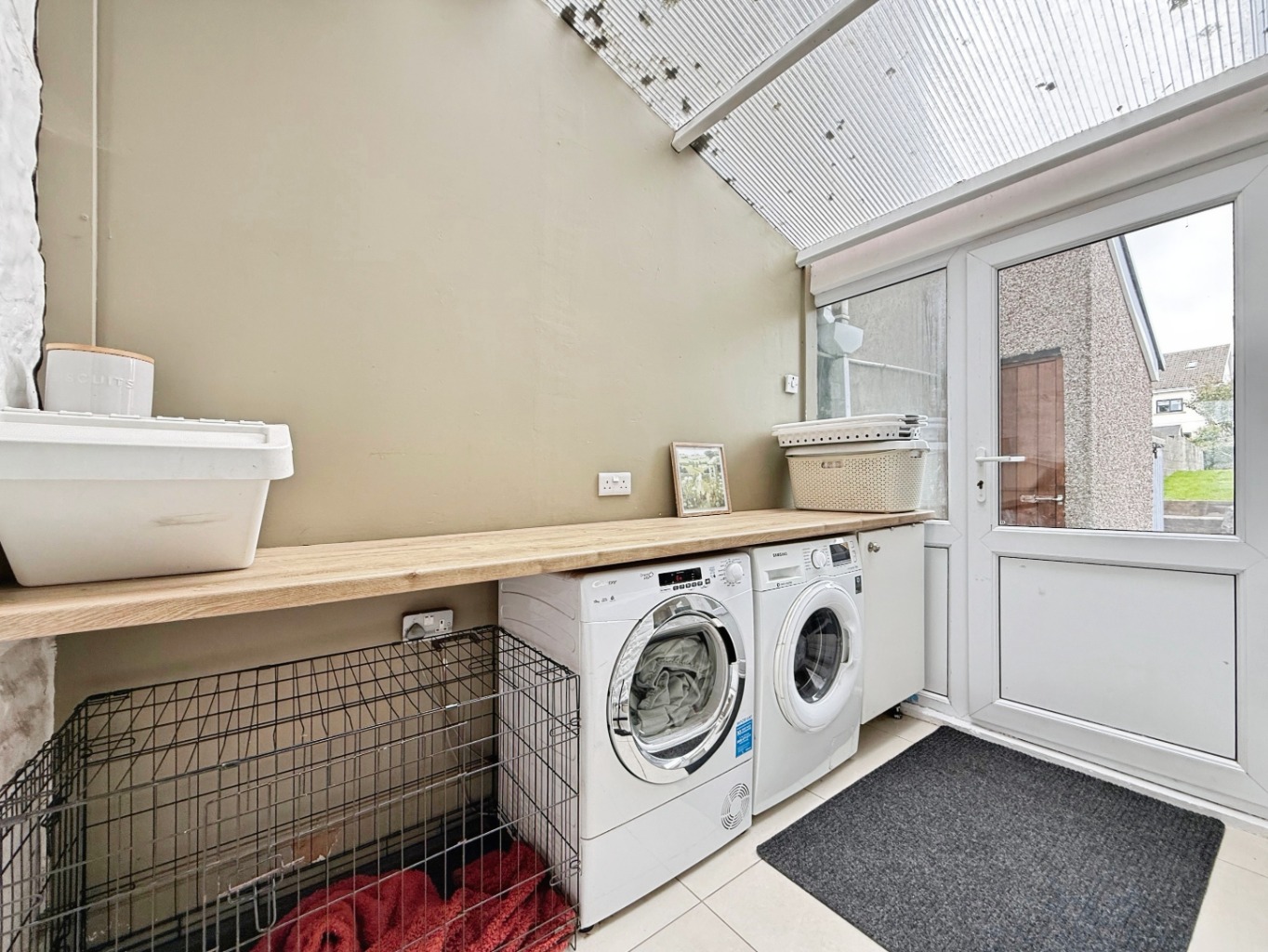 Perspex roof, work surface with space for washing machine and tumble dryer under, uPVC door and window to rear elevation, high gloss tiled flooring.