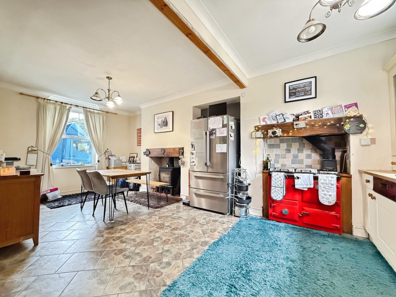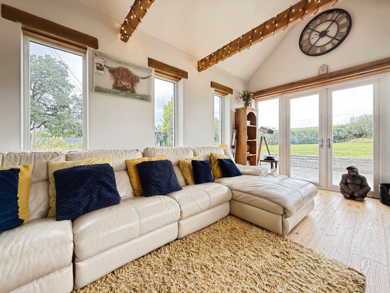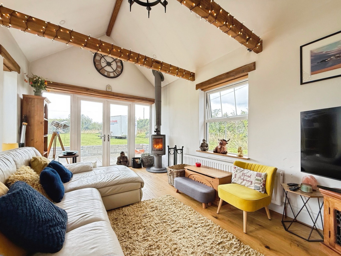 Wooden flooring underfoot, vaulted ceiling, uPVC double glazed windows to front, side and rear elevation, uPVC double glazed patio doors to garden, wood burner, radiator, feature decorative beams and vaulted ceiling.