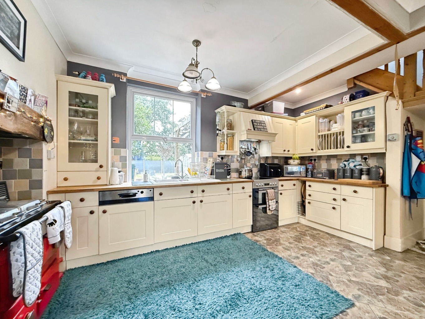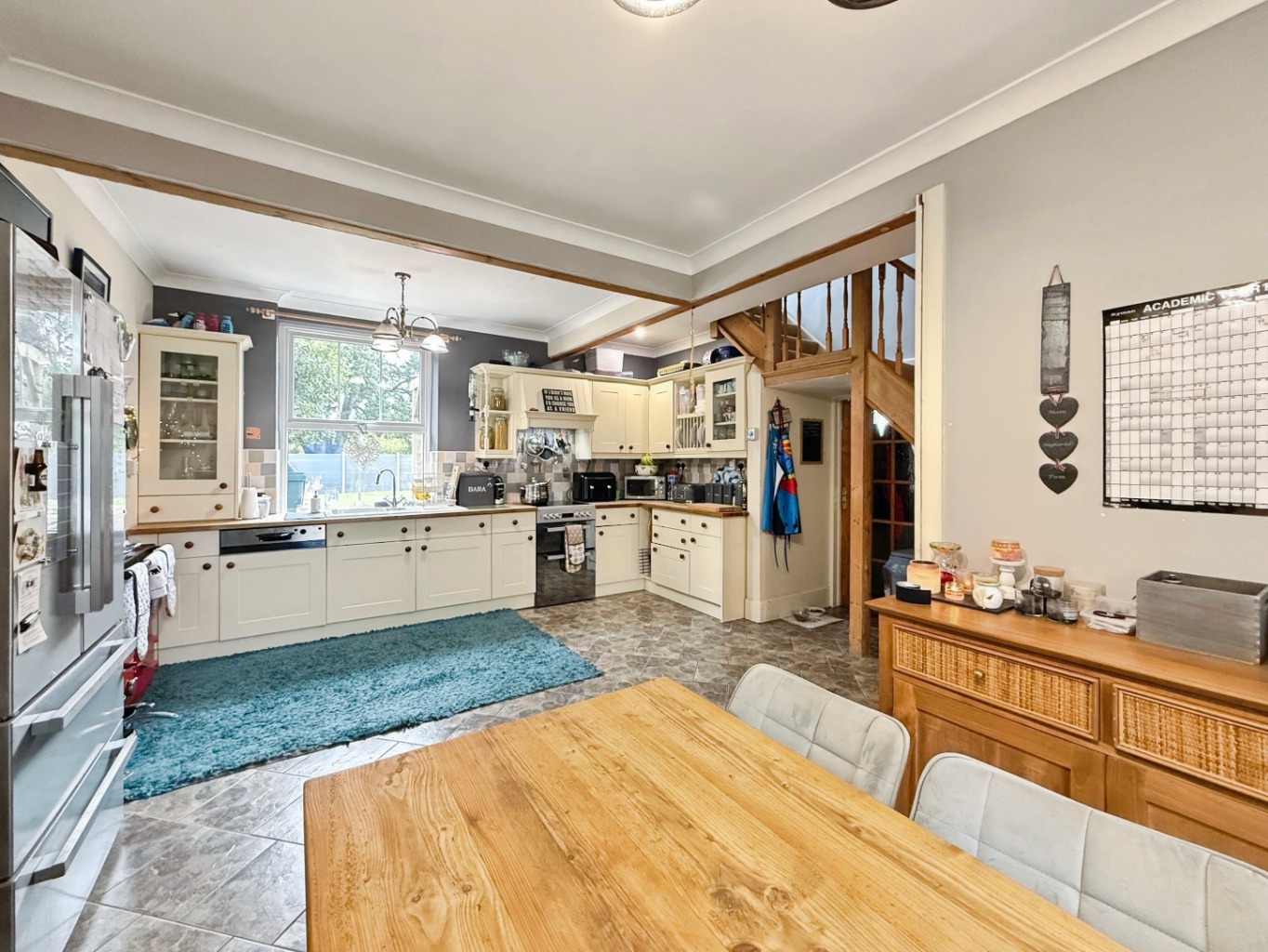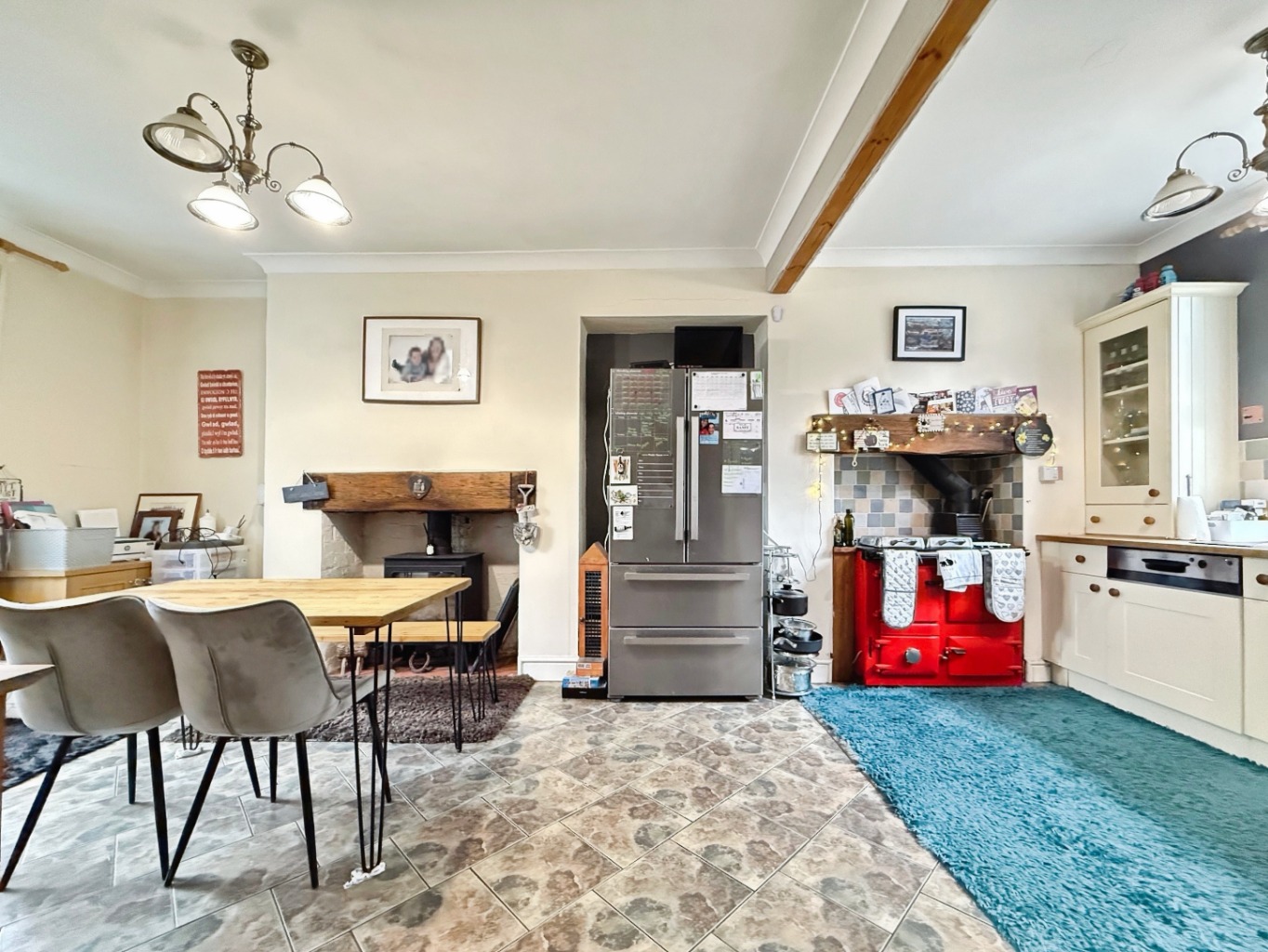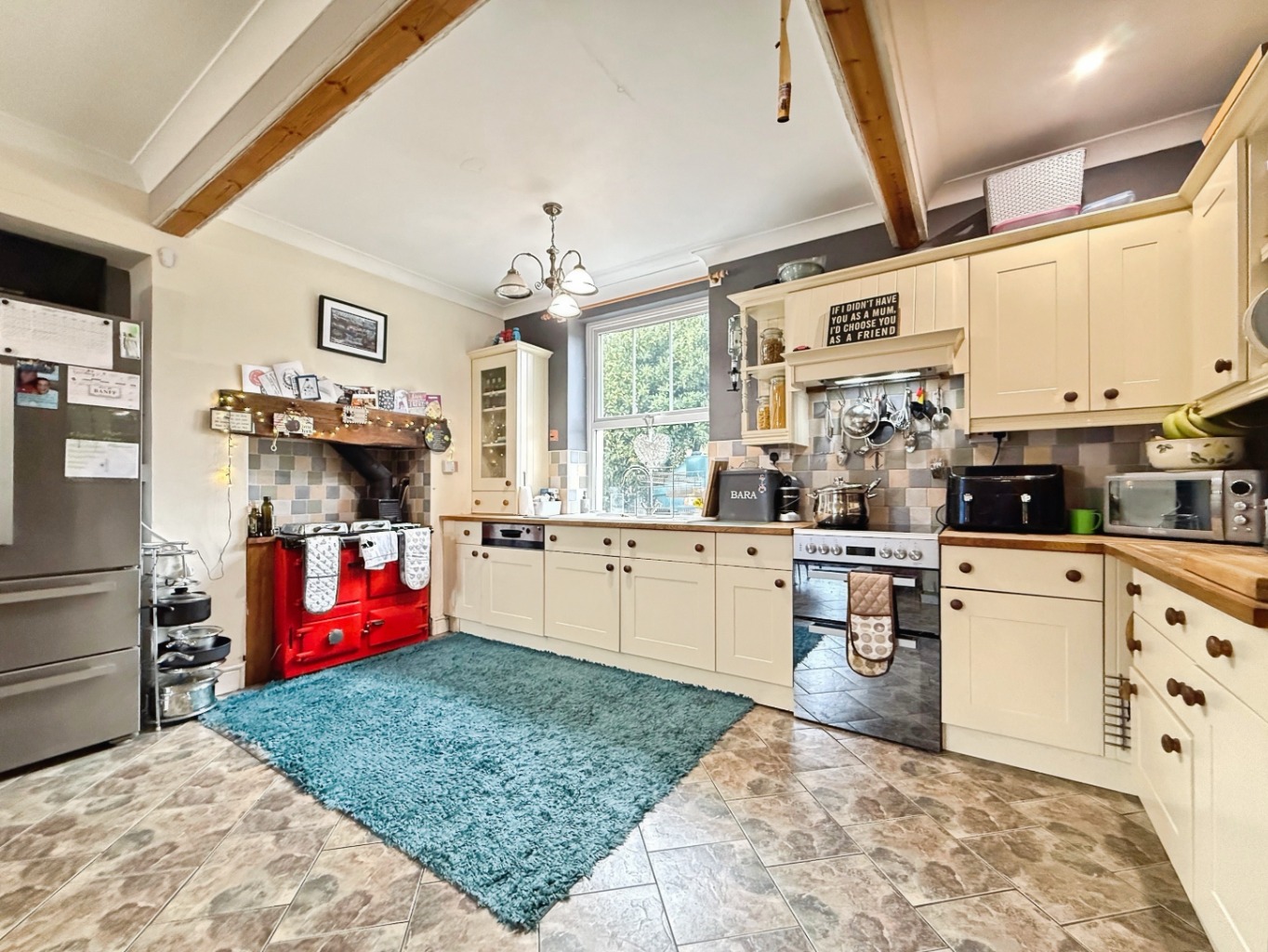 Fitted with a range of matching wall and base units with complimentary work surface over, 1 1/2 bow ceramic sink with on mixer tap, space for American style fridge/freezer, range cooker, integrated dishwasher, space for freestanding cooker with concealed extractor, tiled flooring, wood burner, radiator, uPVC double glazed window to front and rear elevation, door into utility room and cloakroom.