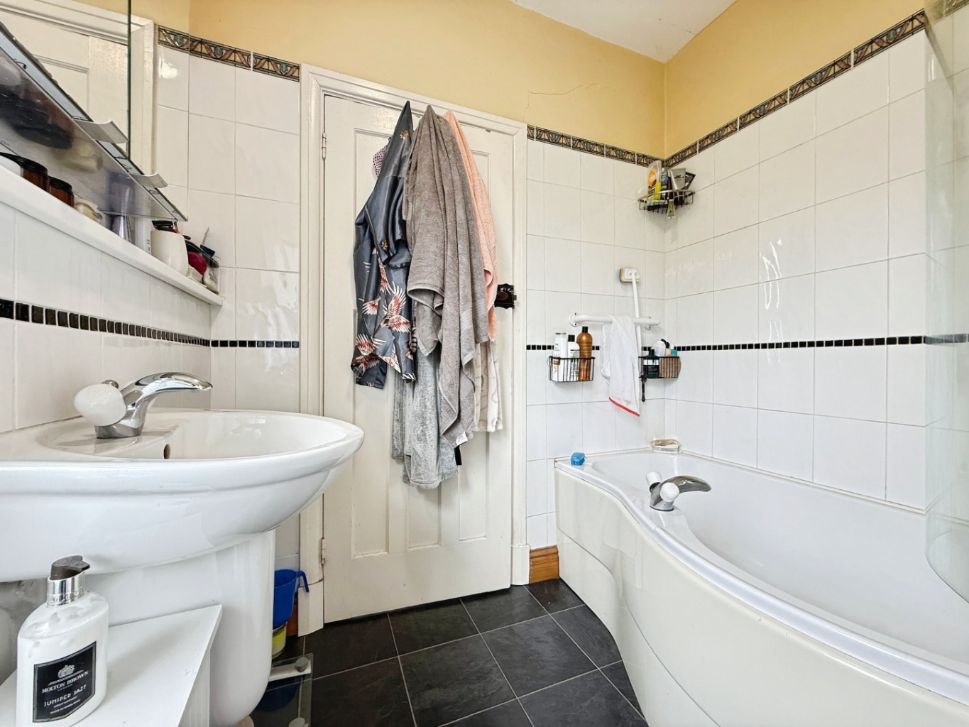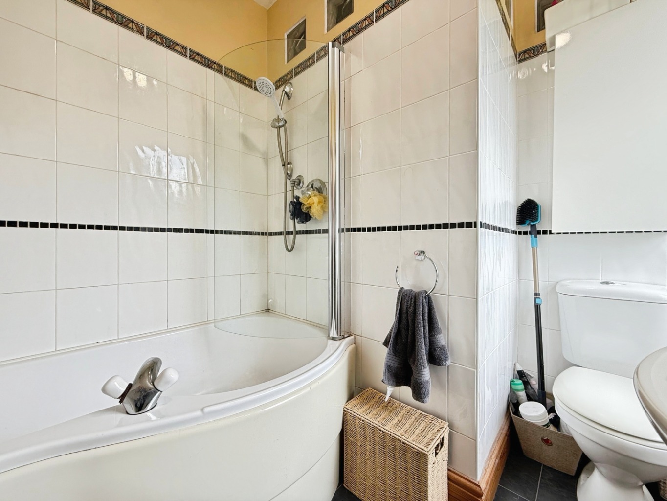 Fitted with a white three piece suite comprising of W/C, pedestal wash hand basin, corner bath with shower overhead and glass modesty screen