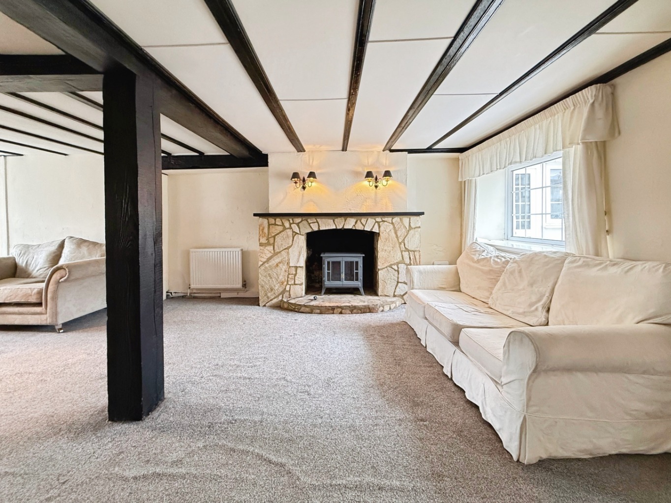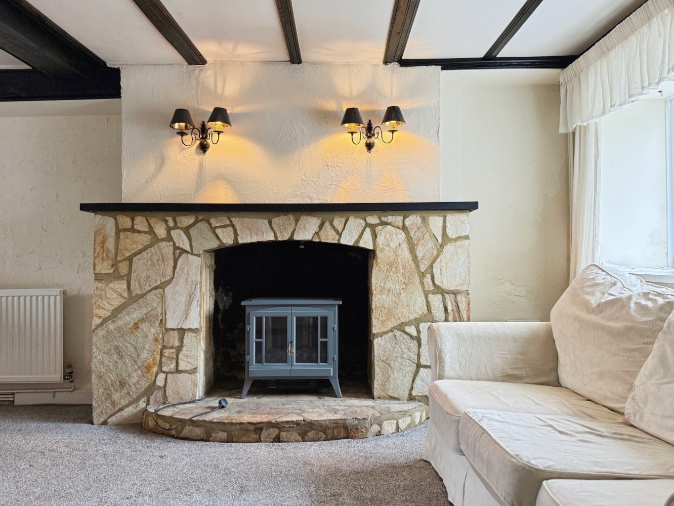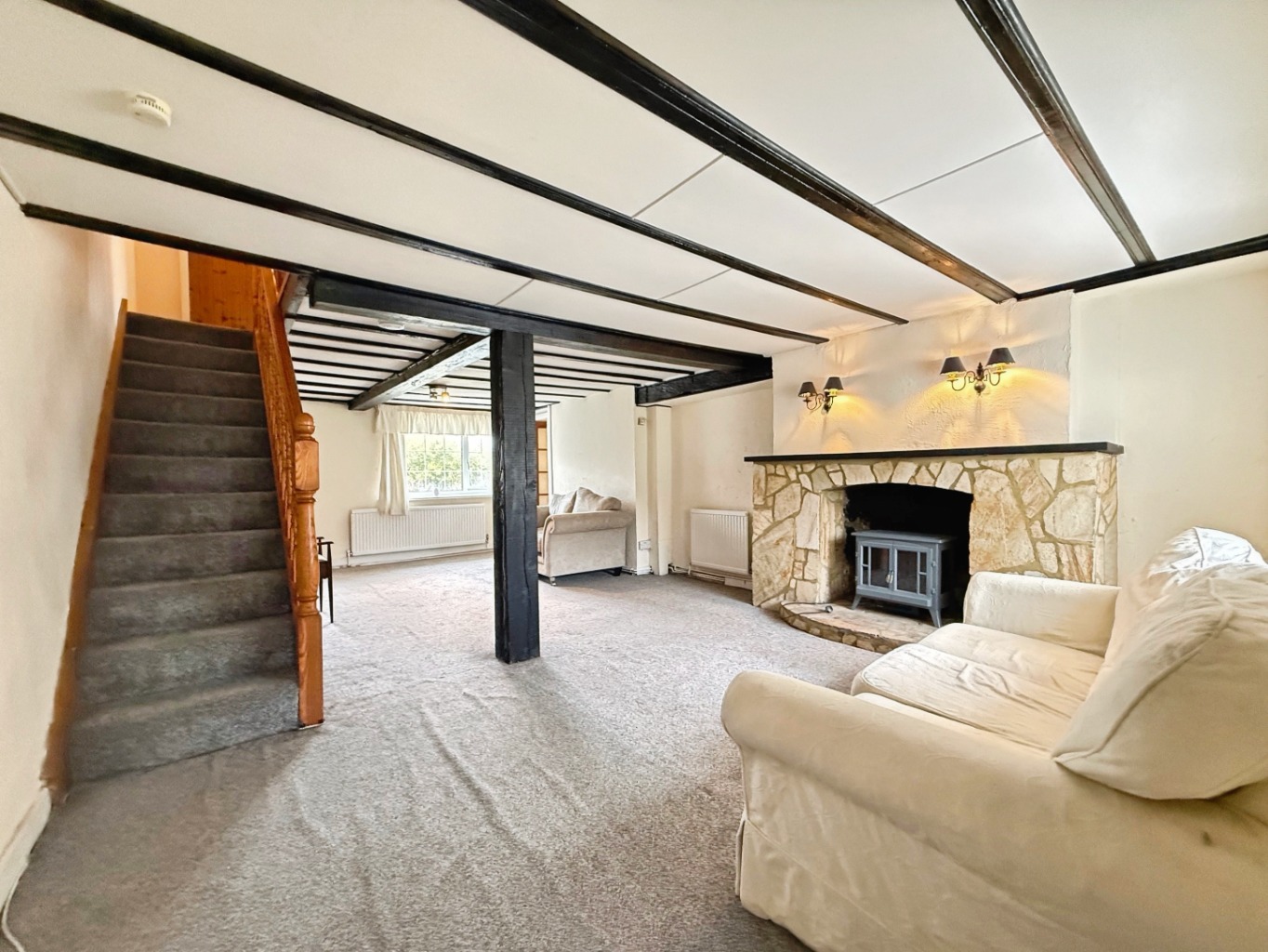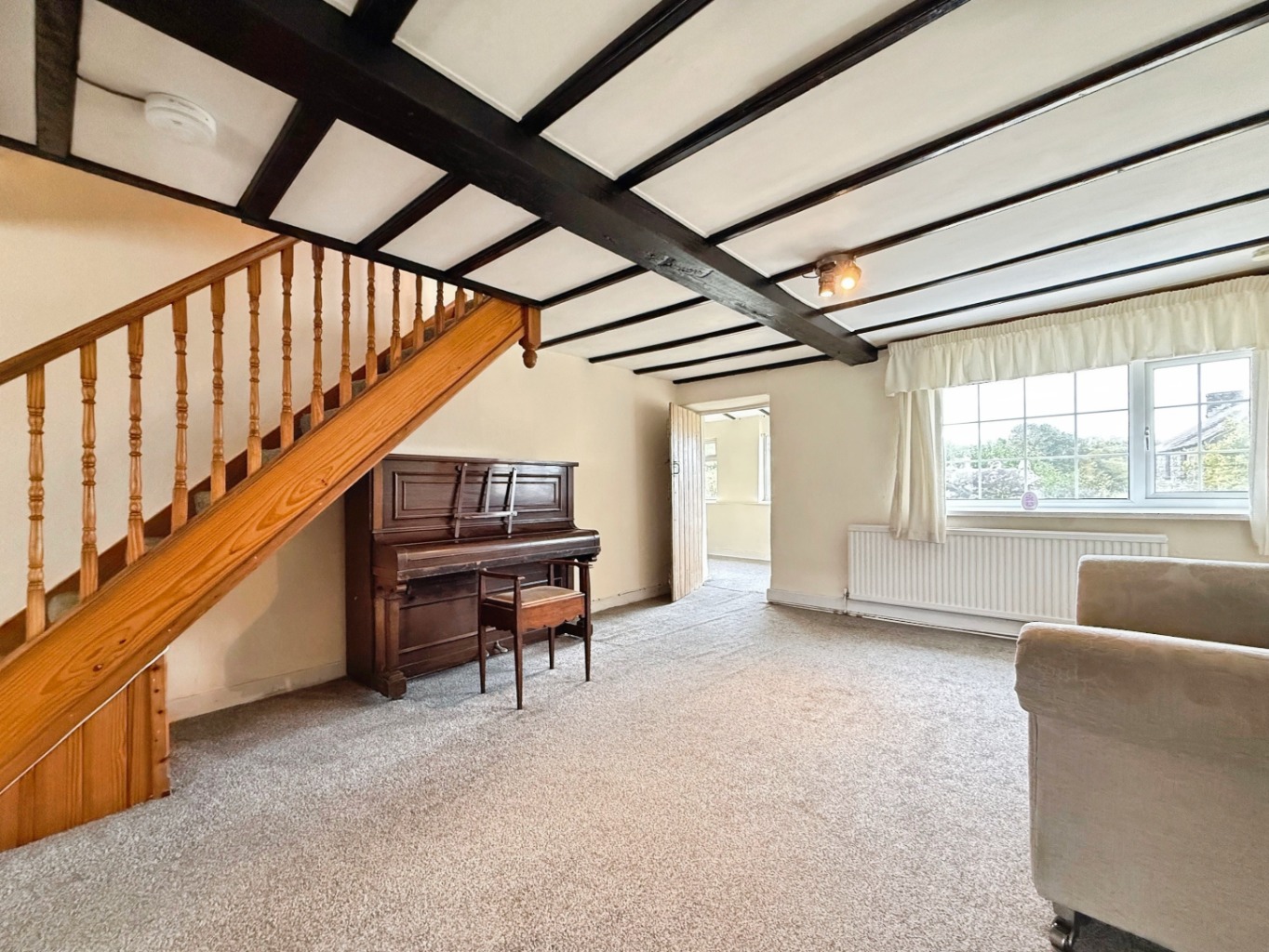 Carpeted underfoot, uPVC double glazed window to front and rear elevation, stone fireplace surround with space for electric fire, wall lights, beams to ceiling, radiator, stairs to first floor accommodation, door into: