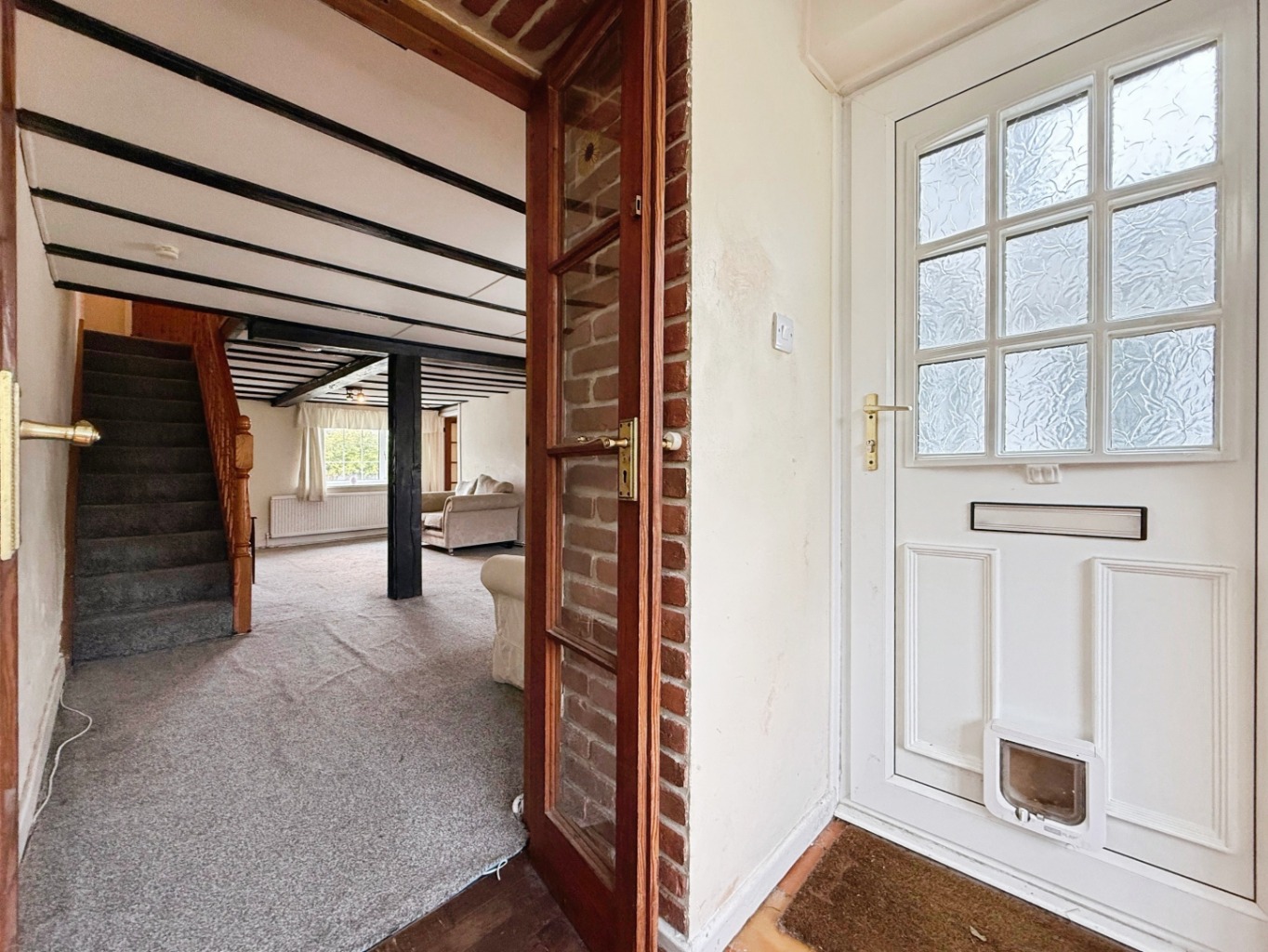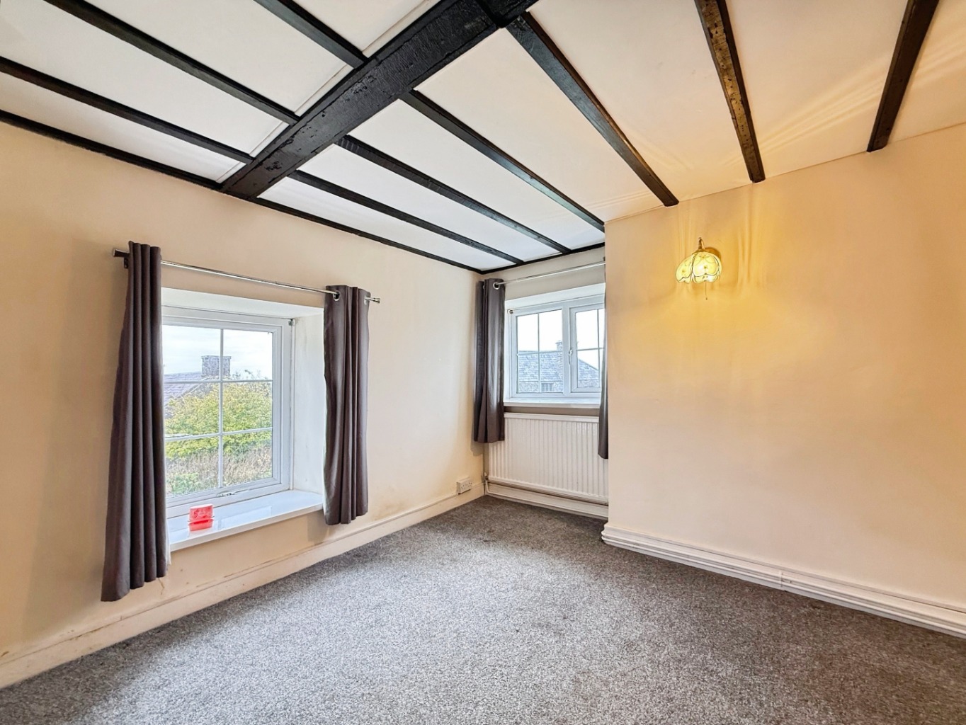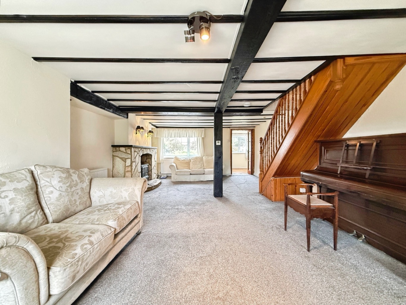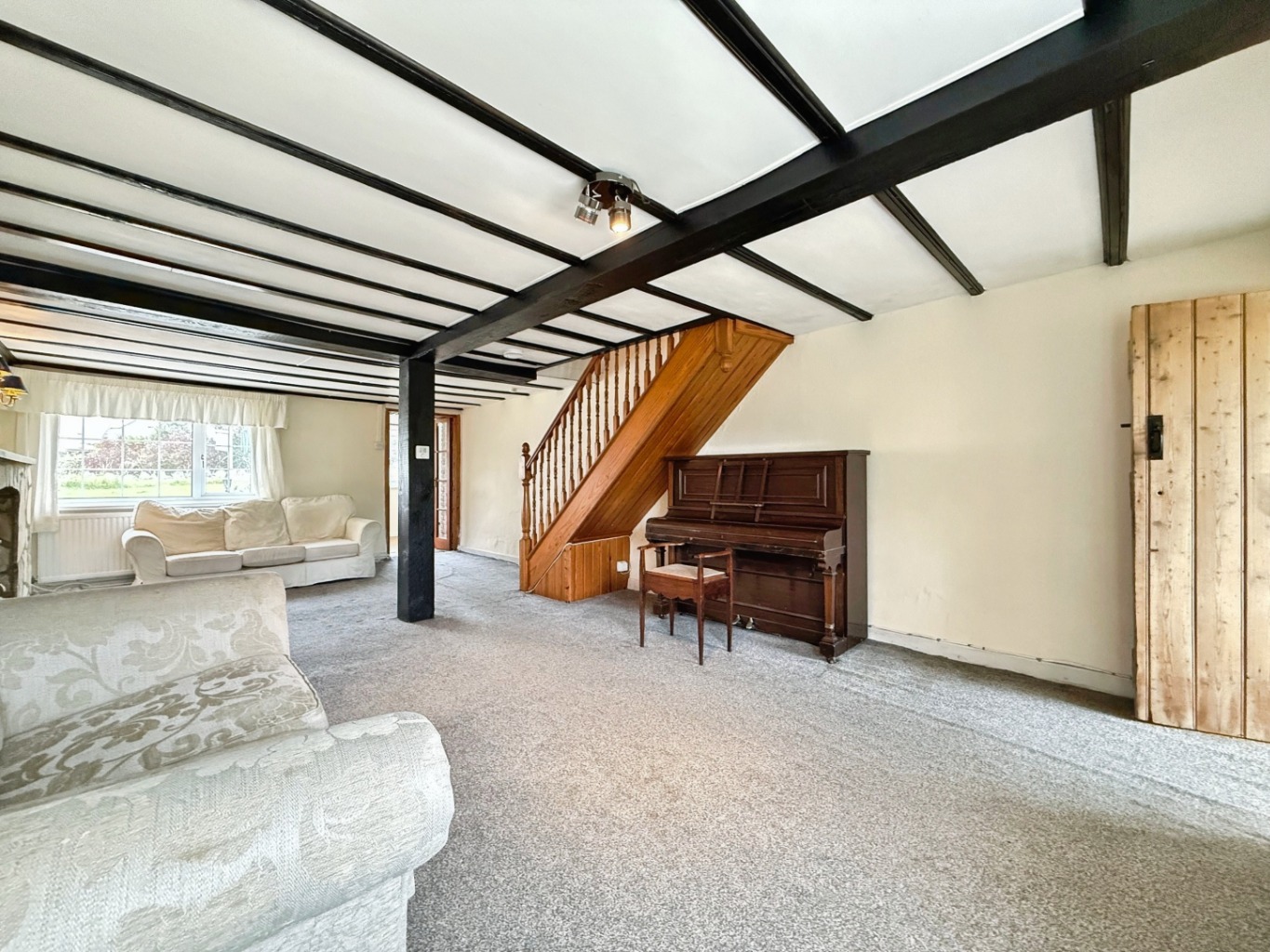 Carpeted underfoot, uPVC double glazed window to front and rear elevation, stone fireplace surround with space for electric fire, wall lights, beams to ceiling, radiator, stairs to first floor accommodation, door into: