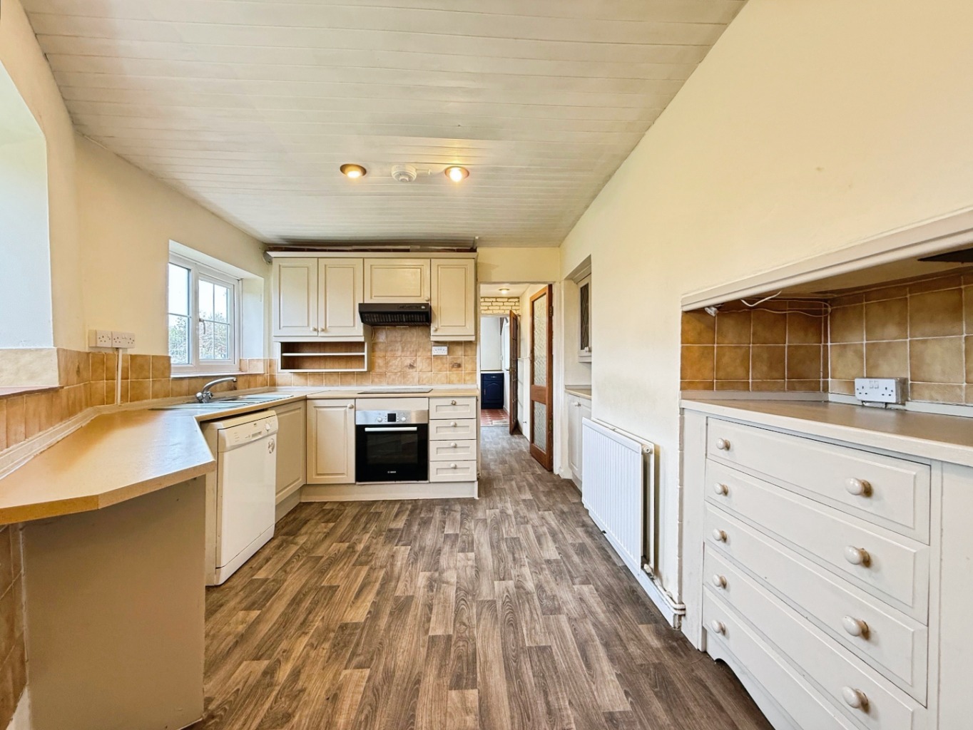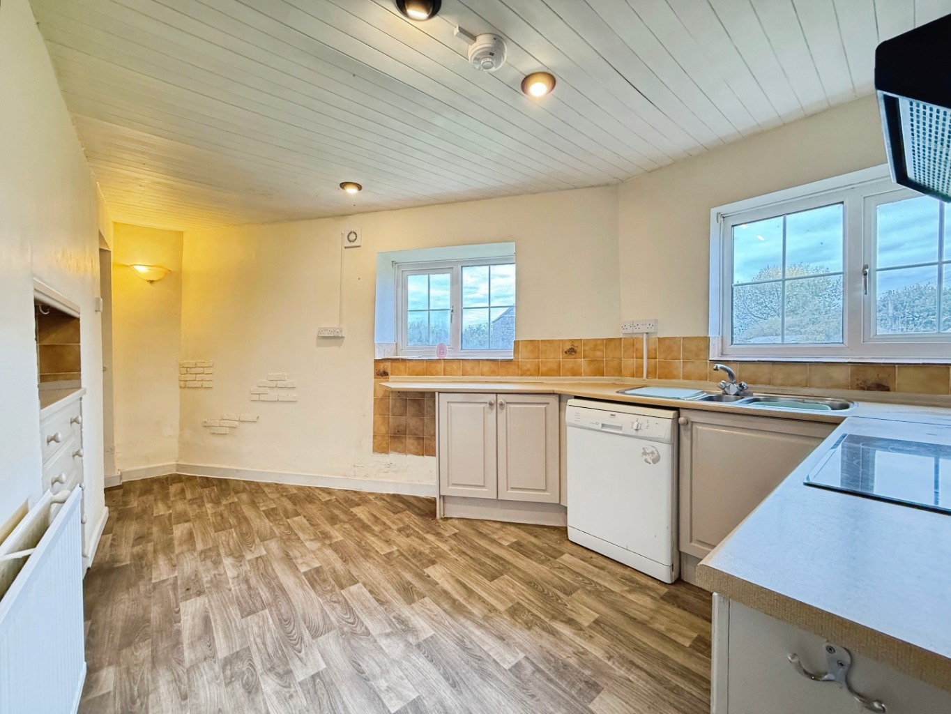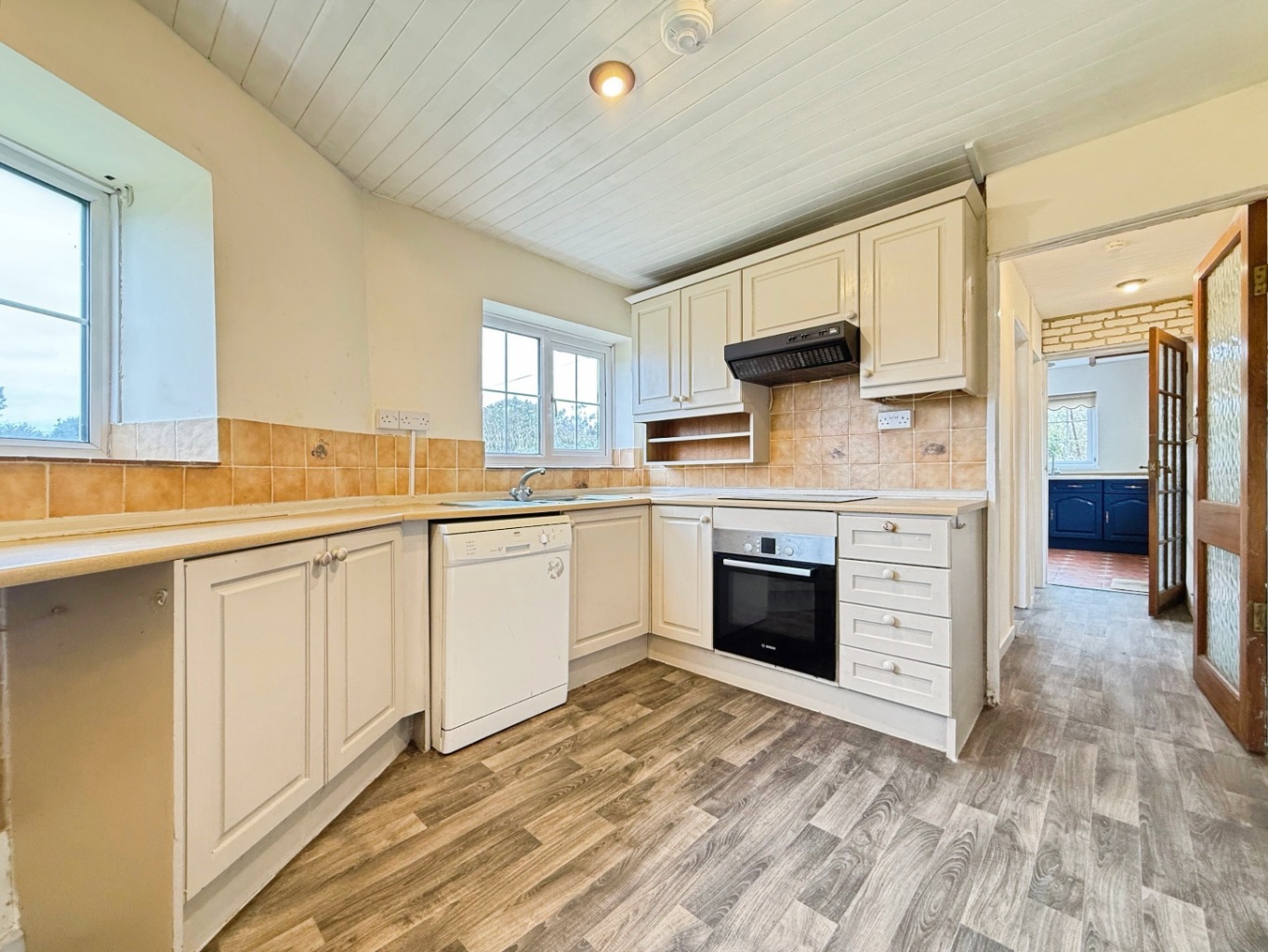 Fitted with a range of matching wall and base units with work surface over, stainless steel sink with mixer tap, integrated electric oven with induction hob and concealed extractor, space for dishwasher, radiator, uPVC double glazed window to side elevation, glazed door into hallway leading into: