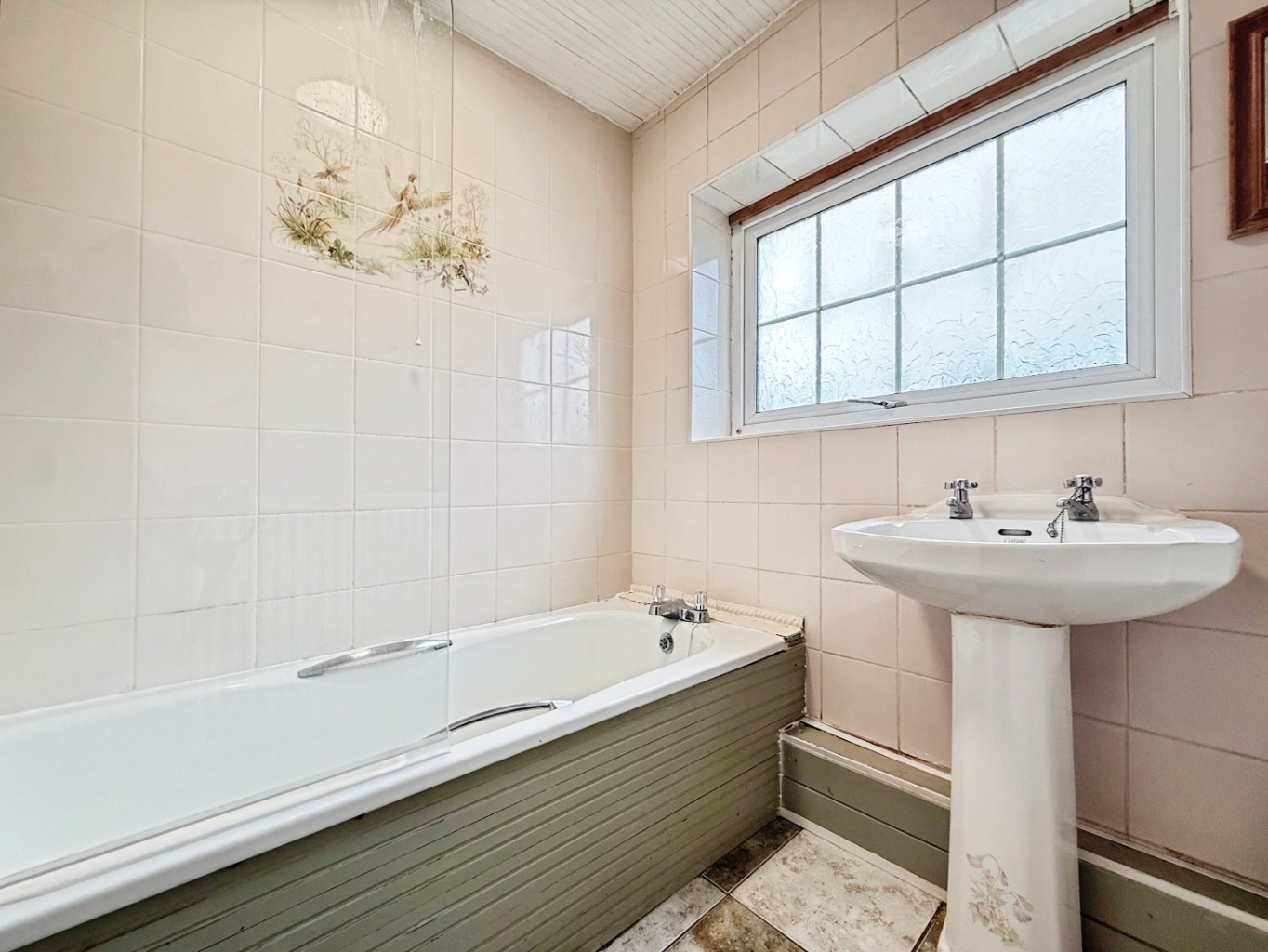 Fitted with a two piece suite comprising of pedestal wash hand basin, paneled bath with shower overhead, fully tiled, uPVC double glazed frosted window to rear elevation.
