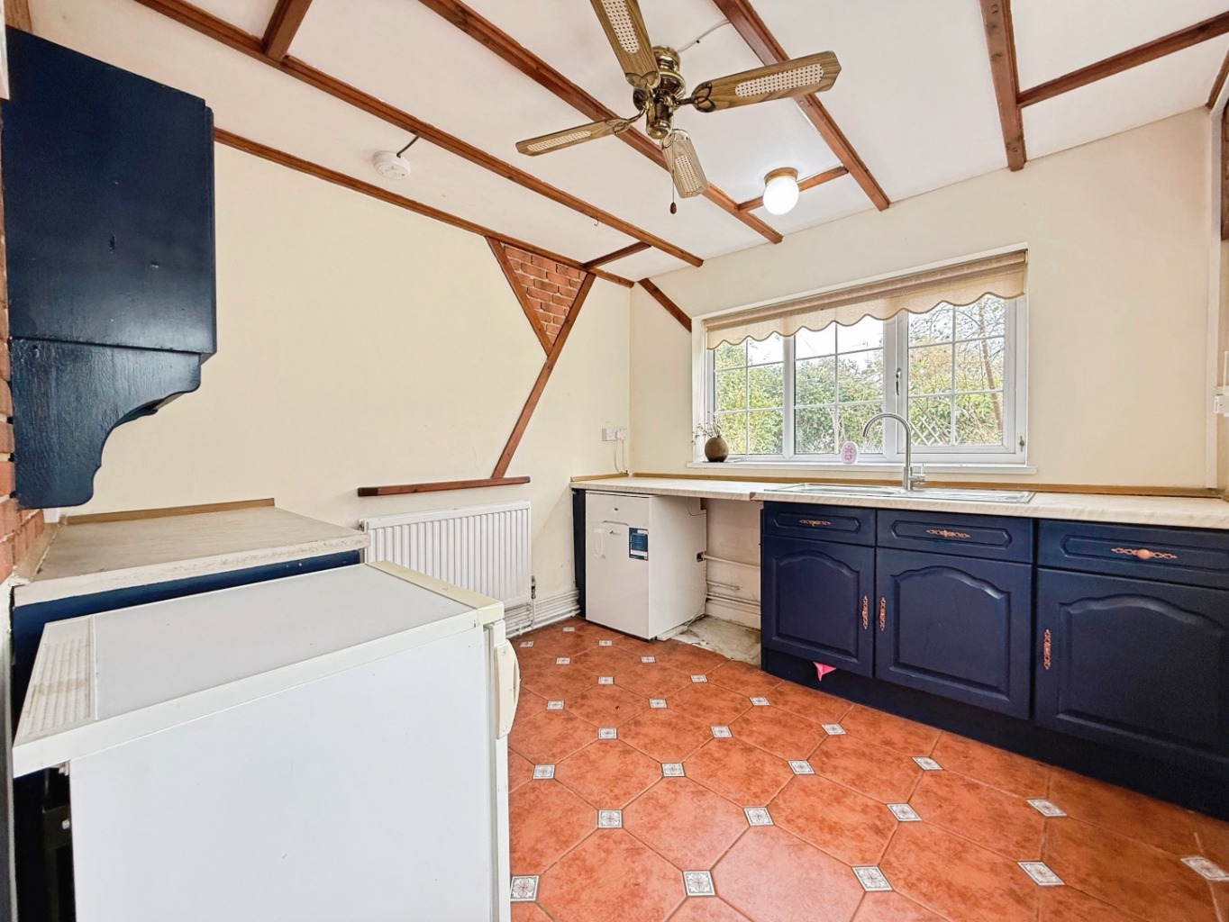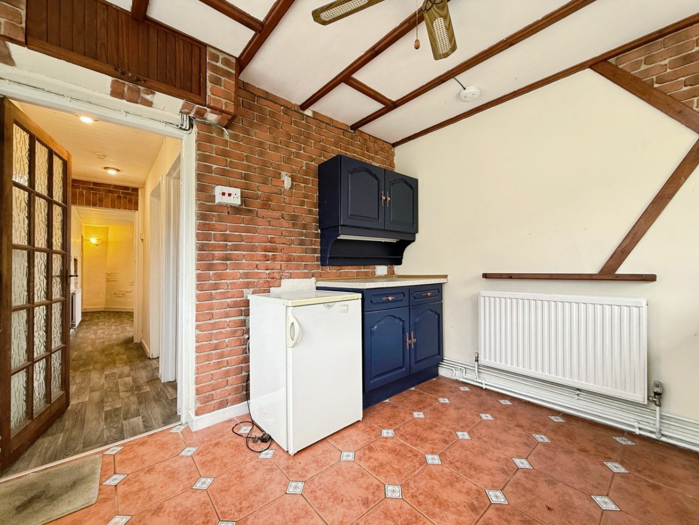 Fitted with a range of matching base units with work surface over, oil boiler, tiled floor, uPVC double glazed window and door, radiator.