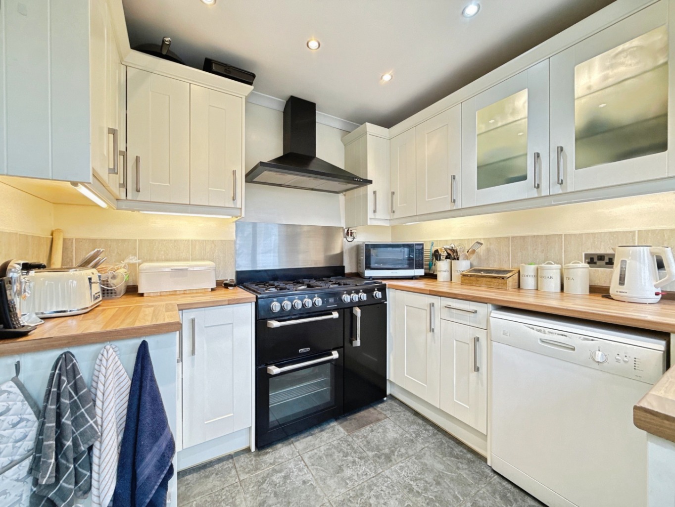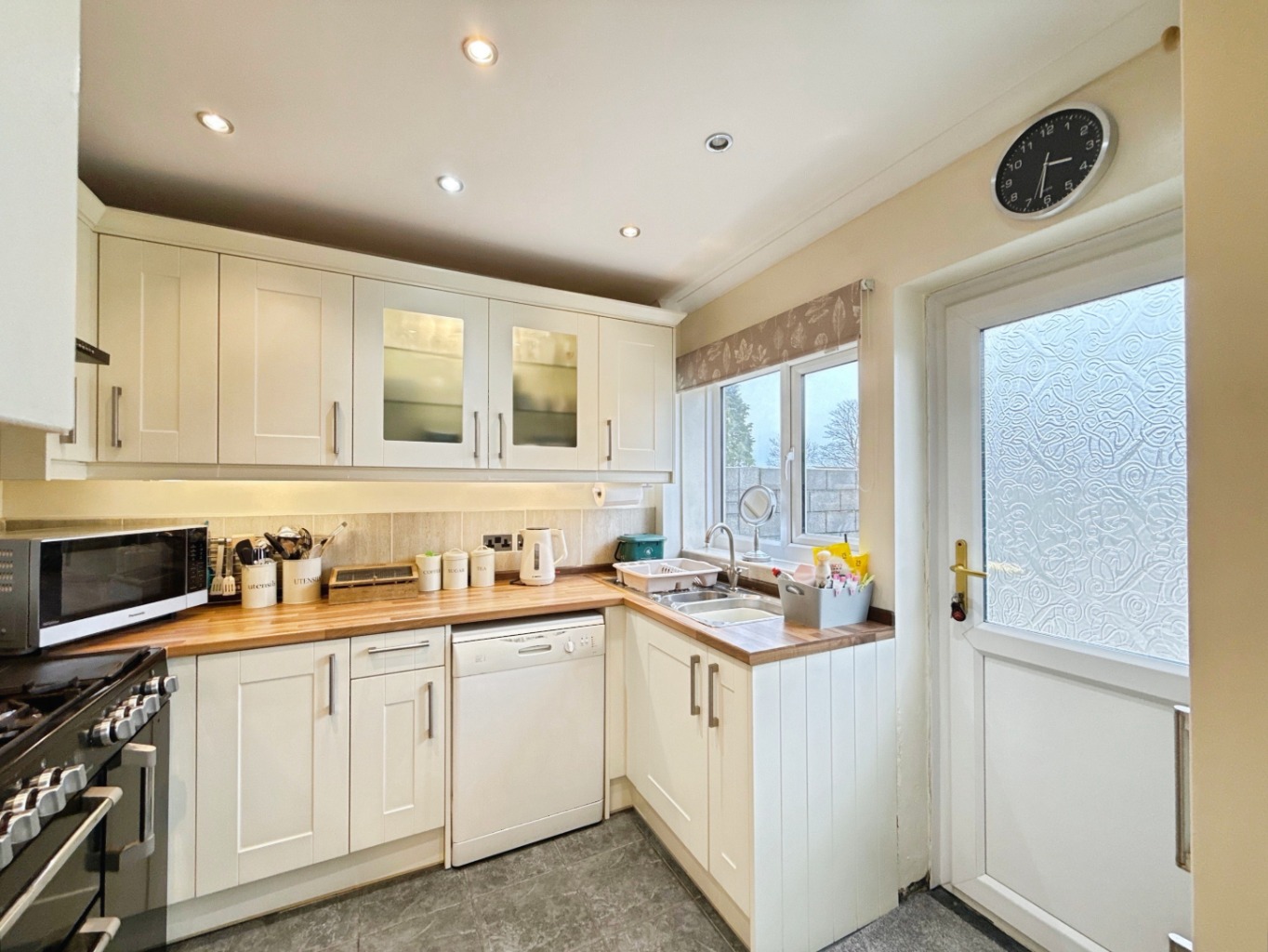 Fitted with a range of matching wall and base units in cream shaker style with complimentary work surface over, 1 1/2 bowl stainless steel sink with mixer tap, space for freestanding range cooker with integrated extractor above, space for dishwasher, part glazed cabinetry, tiled splash back, tiled flooring, spotlights to ceiling, uPVC double glazed window and door to rear elevation.