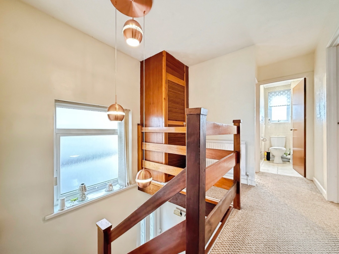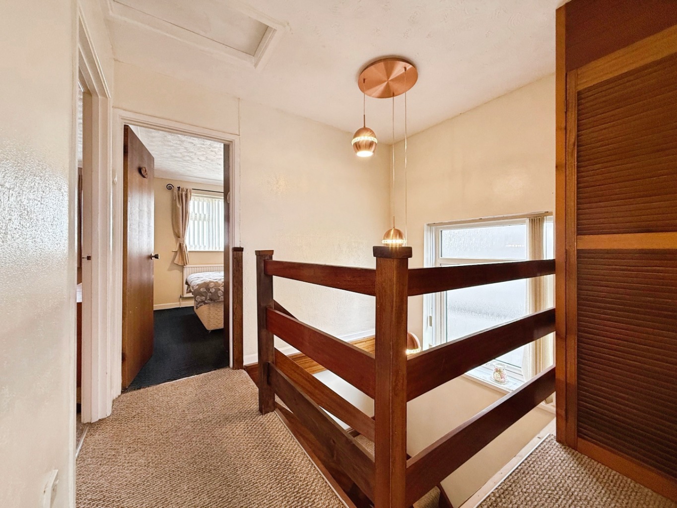 Carpeted underfoot, gallery style landing with feature pendant light, airing cupboard with space for tumble dryer, loft access, doors into: