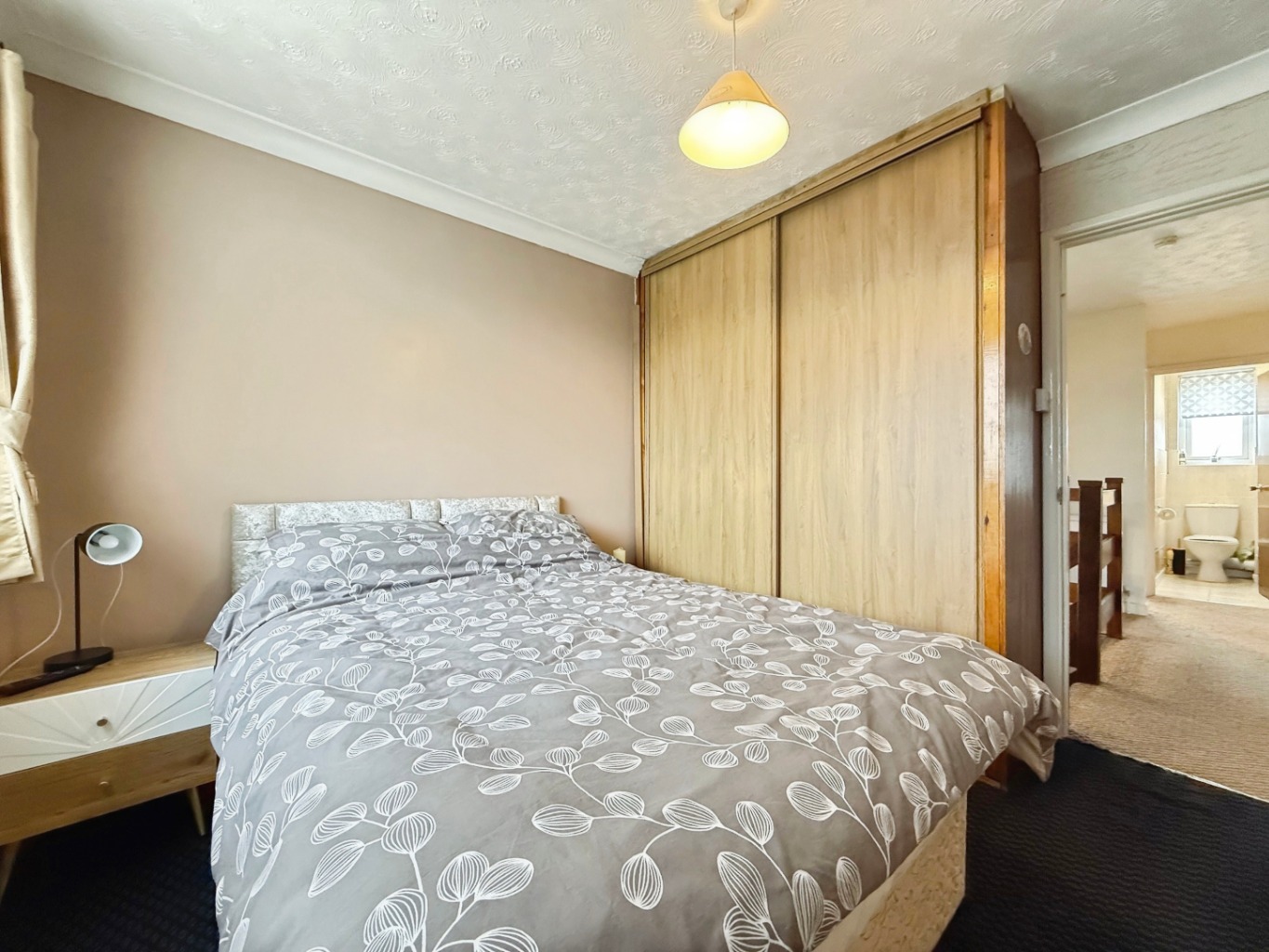 Carpeted underfoot, uPVC double glazed window to front elevation, spotlights to ceiling, radiator, utility style cupboard housing space for washing machine, wall hung gas combination boiler.
