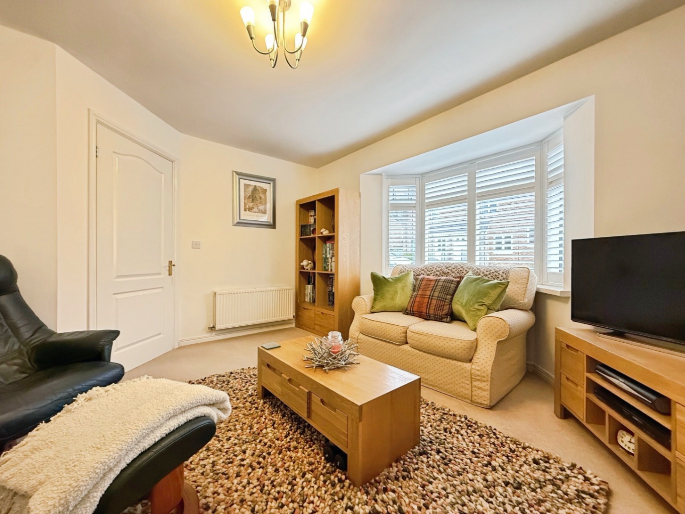 Carpeted underfoot, radiator, decorative fireplace, uPVC double glazed bay style window to front elevation with fitted shutter blinds.
