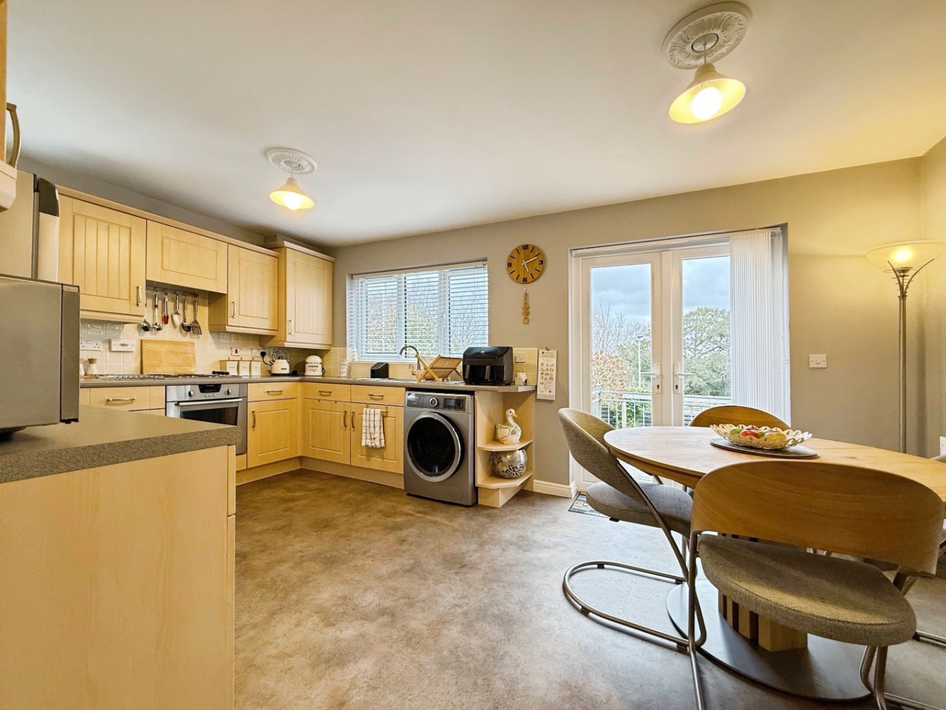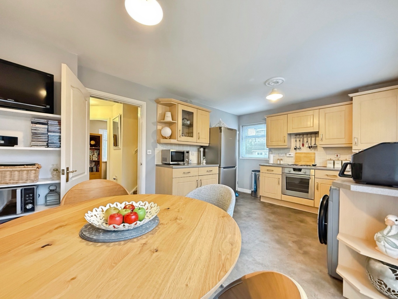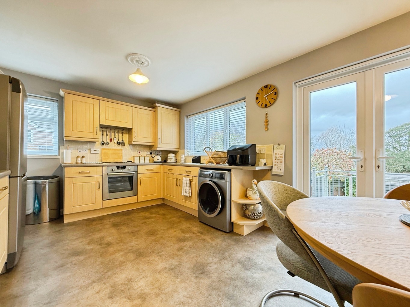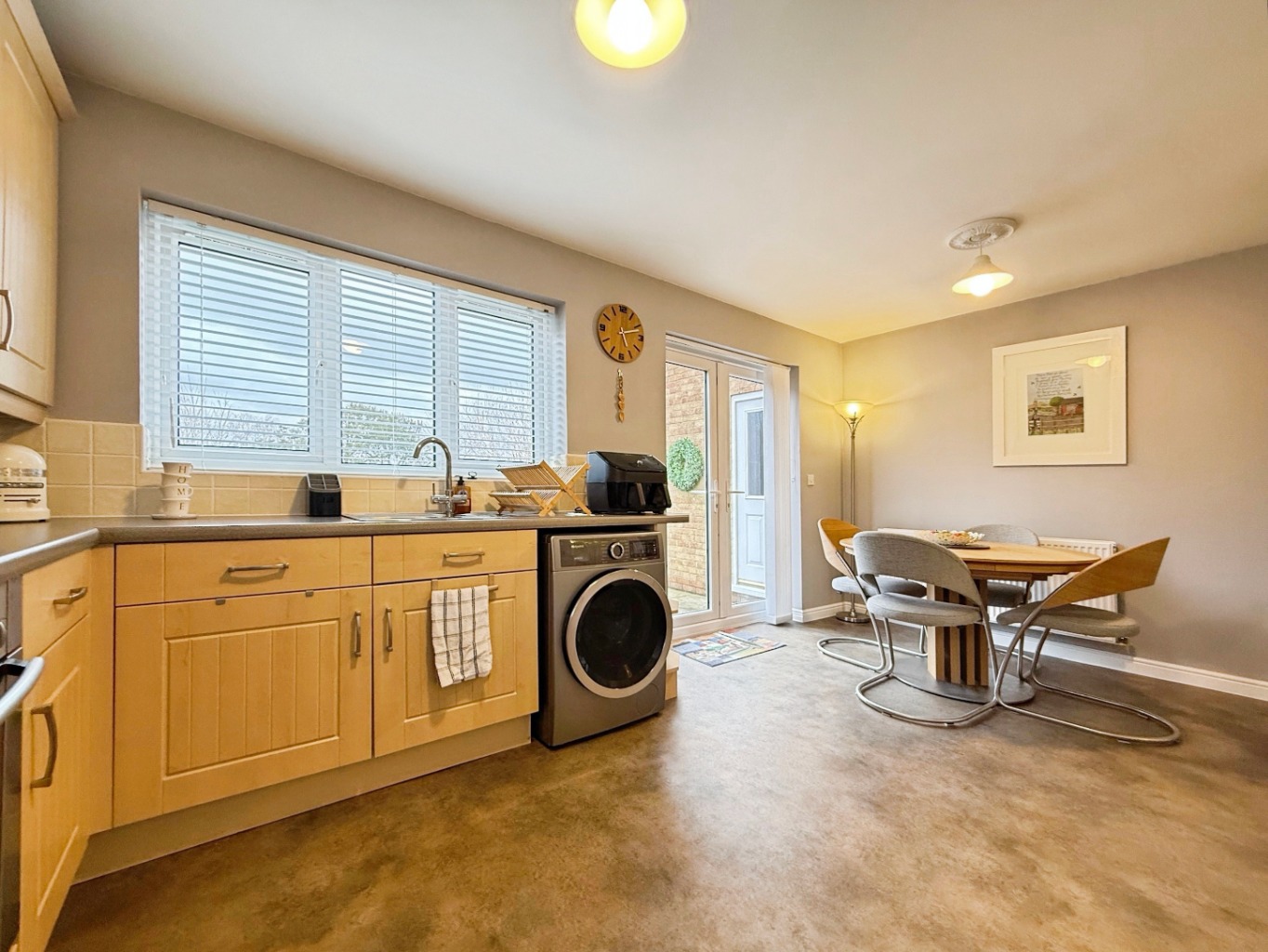 Fitted with a range of matching wall and base units with complimentary work surface over, tiled splashback, stainless steel sink with mixer tap, four ring gas hob with electric oven under and extractor over, space for freestanding washing machine, space for freestanding fridge/freezer, wall mounted gas boiler set in concealed unit, understairs storage cupboard, vinyl flooring, uPVC double glazed window to side elevation, uPVC double glazed window to rear elevation, uPVC double glazed patio doors to rear elevation, radiator.