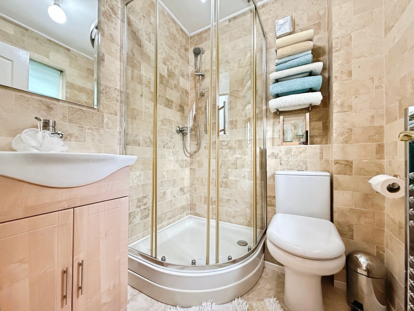 Fitted with a white three piece suite comprising of W/C, sink set in vanity unit, walk in shower, radiator, uPVC double glazed frosted window to front elevation, fully tiled walls.
