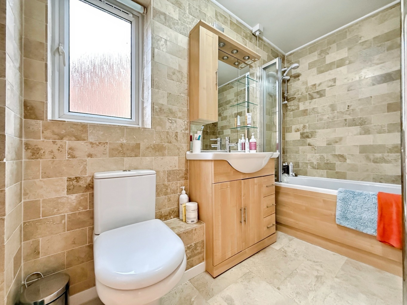 Fitted with a white three piece suite comprising of W/C, sink set in vanity unit, paneled bath with shower overhead and glass modesty screen, polished chrome heated towel rail, uPVC double glazed frosted window to side elevation, fully tiled walls.