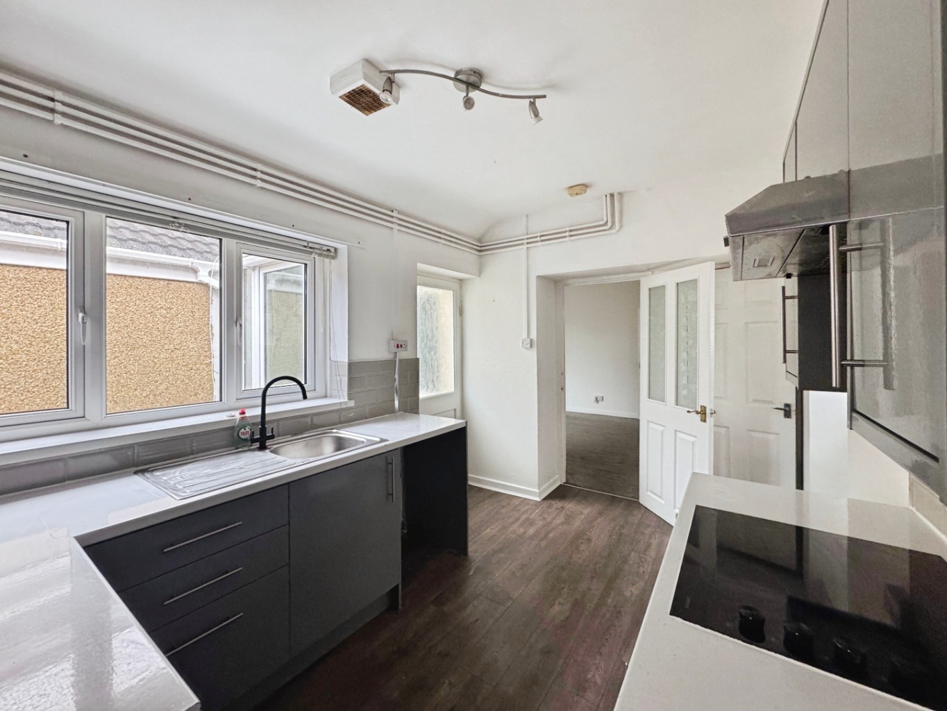 Fitted with a range of high gloss wall and base and units with work surface over, stainless steel sink with drainer and mixer tap, electric oven with extractor fan over. Tiled splash back, plumbing for washing machine, door under stairs storage cupboard. Upvc double glazed window, Wooden door to porch. Obscure glazed window, door to: