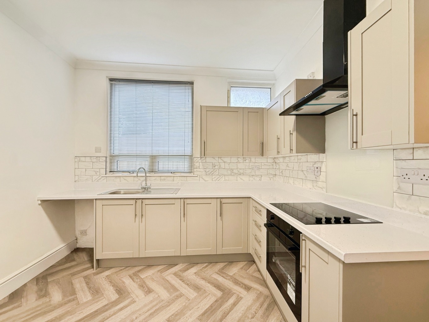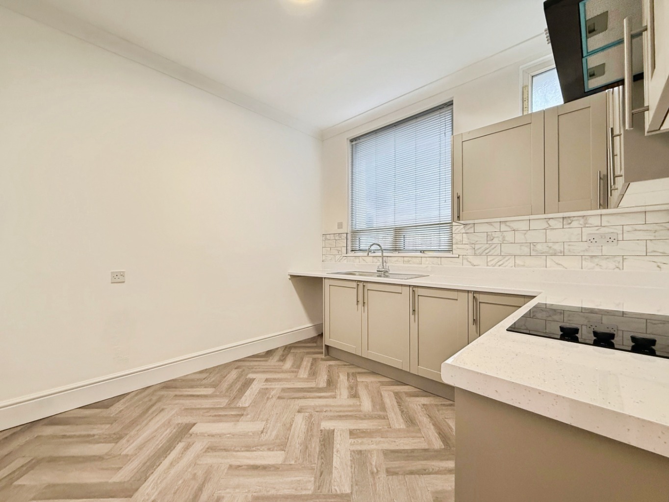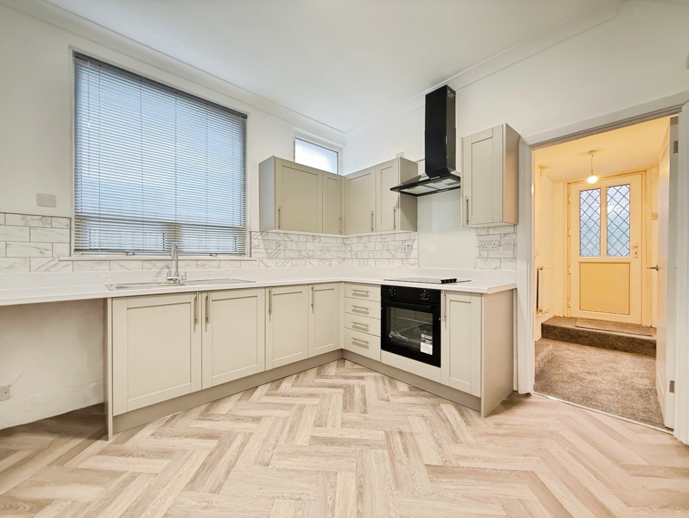 Fitted with a range of shaker style wall and base units with work surface over, stainless steel sink with drainer and mixer tap, four ring ceramic hob with extractor fan over and electric oven under, plumbing for washing machine, uPVC double glazed window, obscure uPVC double glazed window, radiator, tiled splash back, wood effect herringbone vinyl flooring, door to: