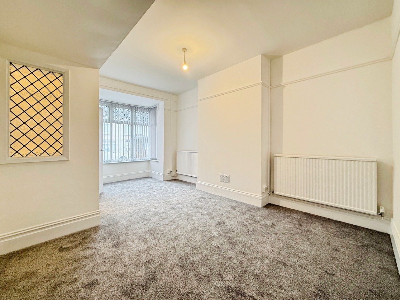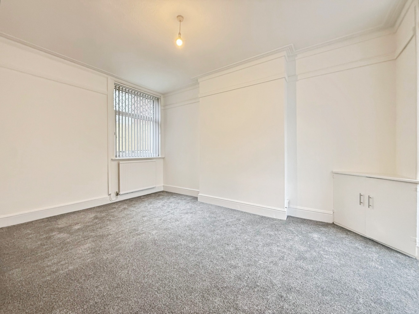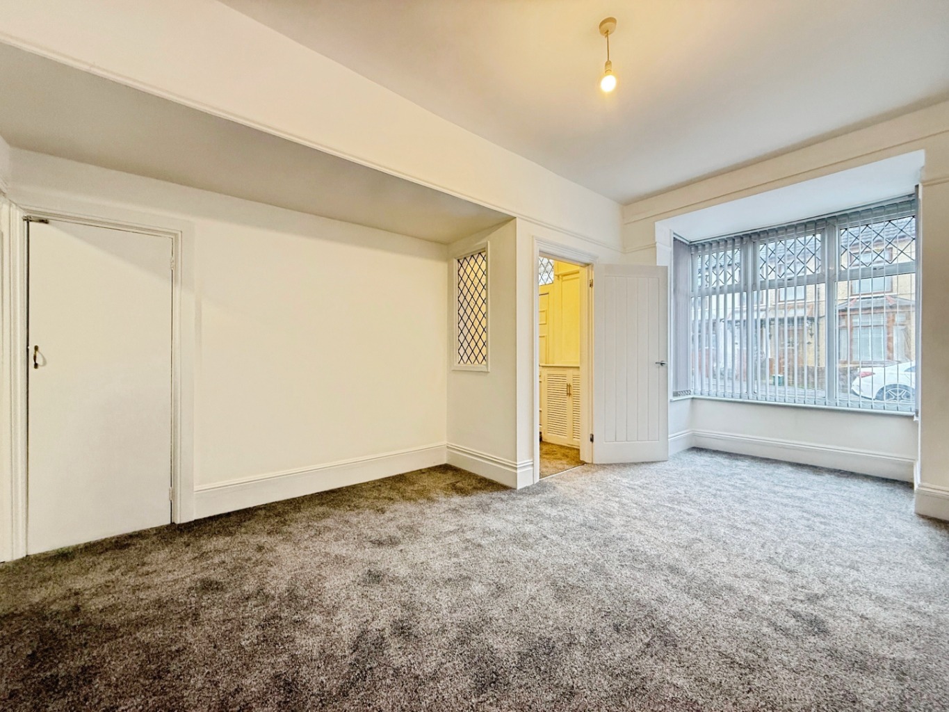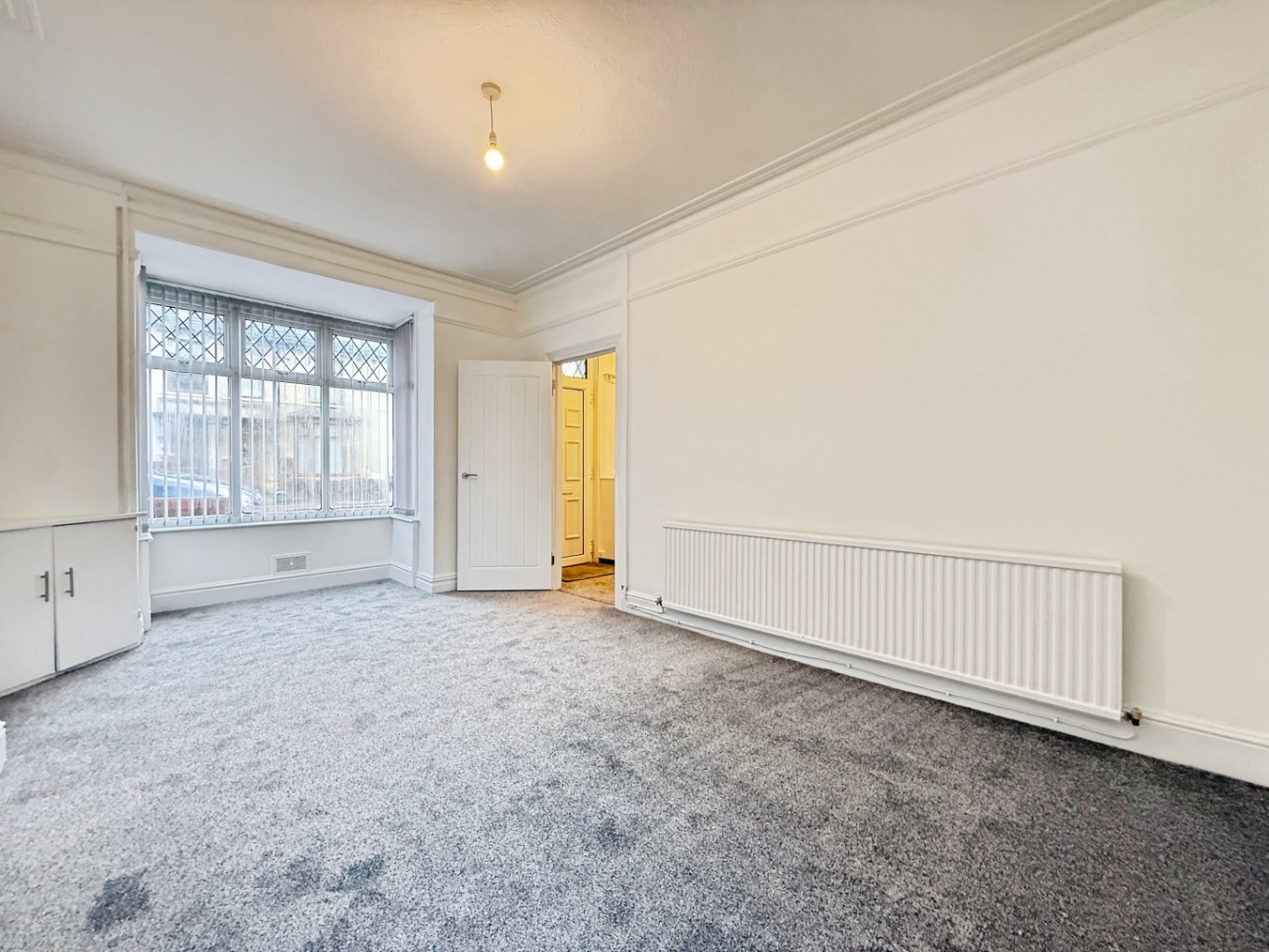 uPVC double glazed bay window, radiator, uPVC double glazed bay window, cupboard housing gas meter, picture rails,decorative architrave to ceiling.