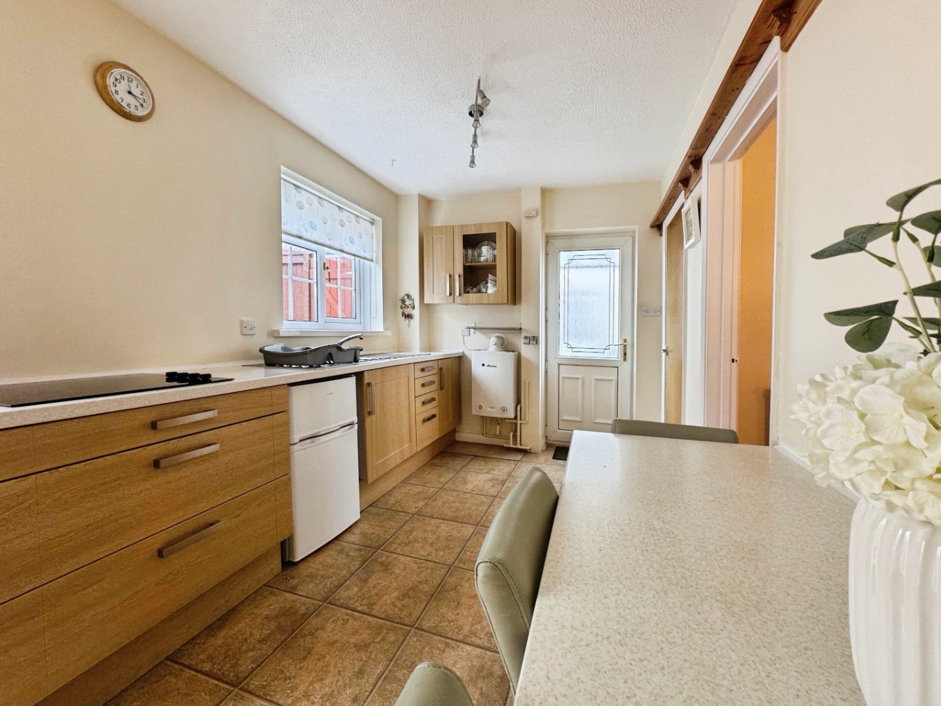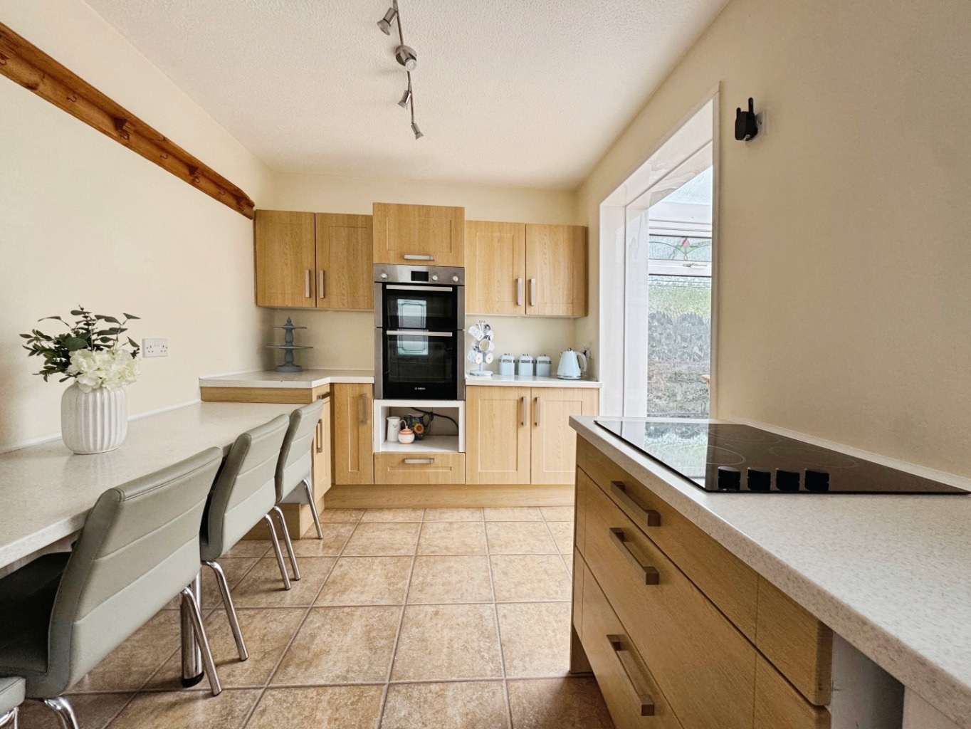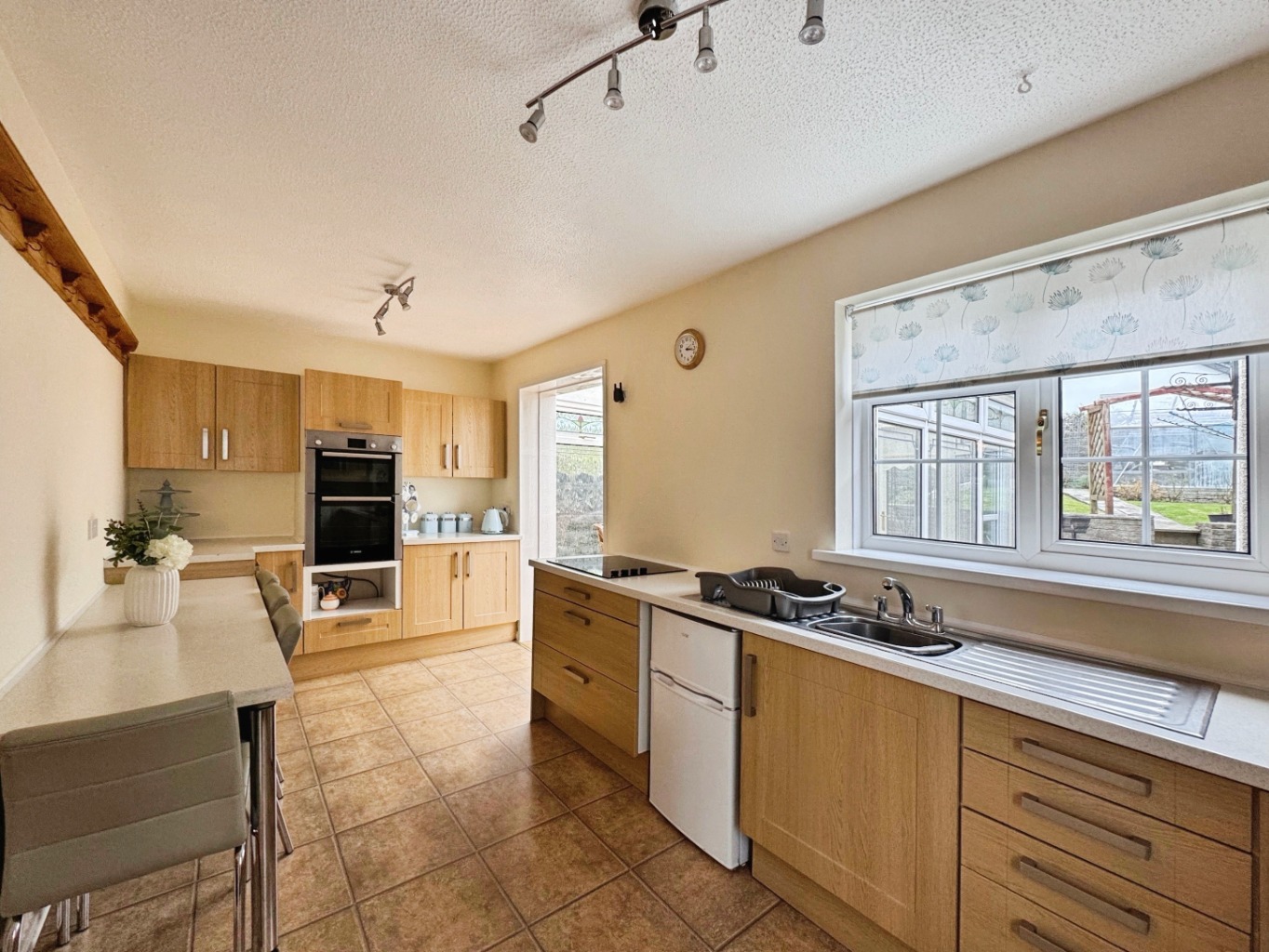 Fitted with a range of matching wall and base units with work surface over, four ring ceramic hob, stainless steel sink with two drainers and mixer tap, eye level oven and grill, space for under counter fridge/freezer, wall mounted gas boiler, tiled floor, obscure uPVc double glazed door, uPVC double glazed window, breakfast bar, door to under stairs storage cupboard, opening into: