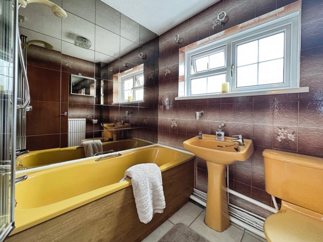 Fitted with a three piece suite comprising of bath with shower over and folding modesty screen, wash hand basin and w.c, tiled floor, tiled walls, obscure uPVC double glazed window, radiator.