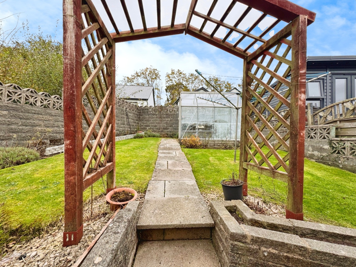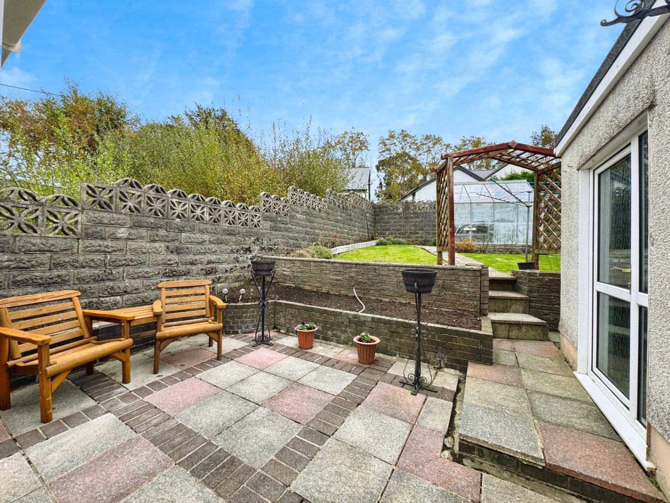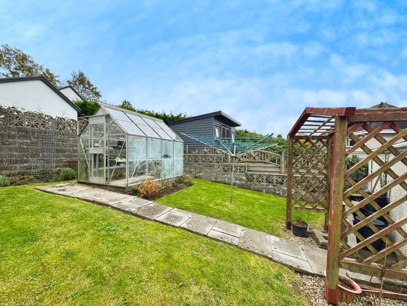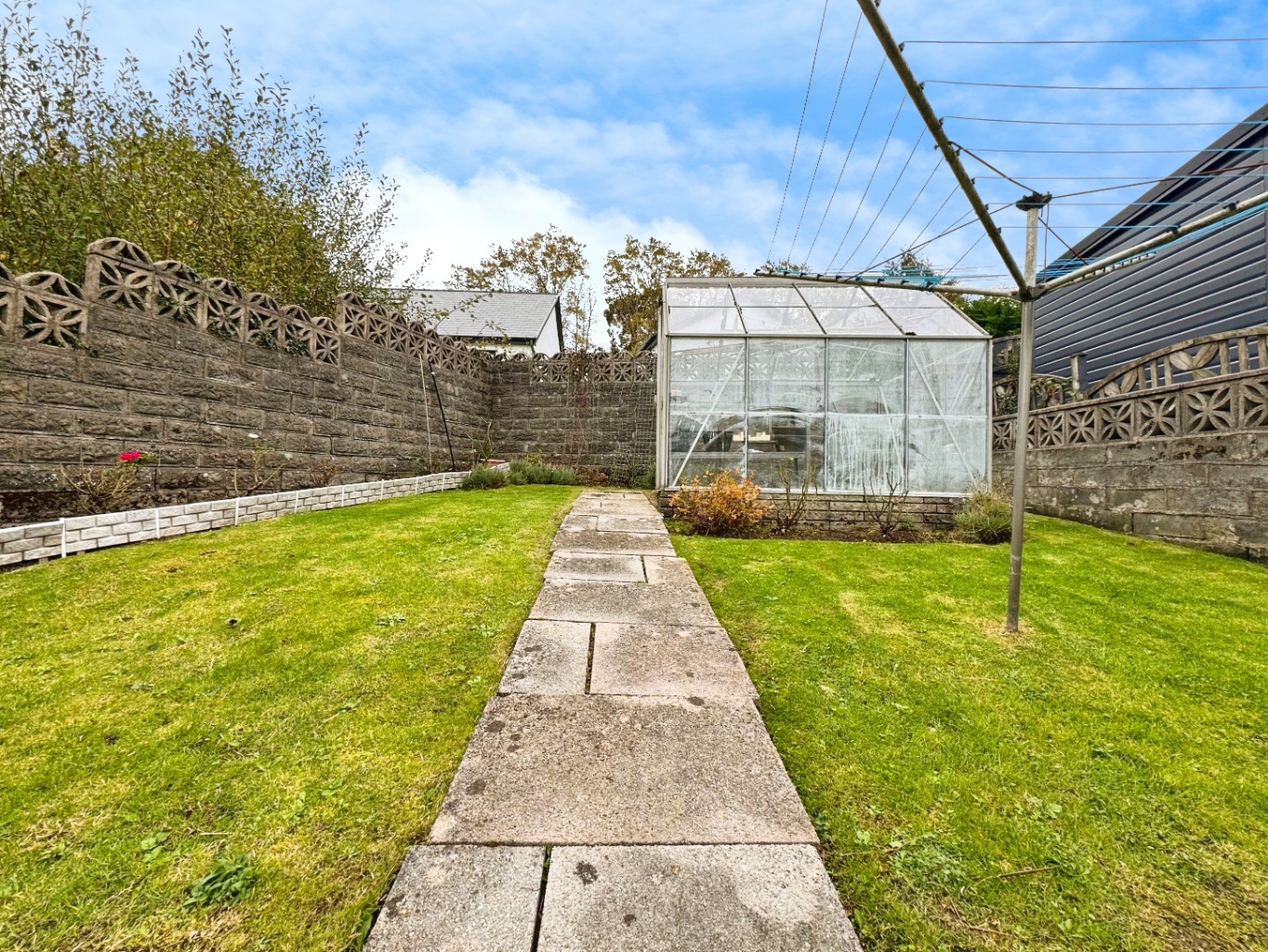 Gated side pedestrian access leads to the rear garden that has been landscaped to provide a paved patio with steps leading to a lawned area housing the greenhouse