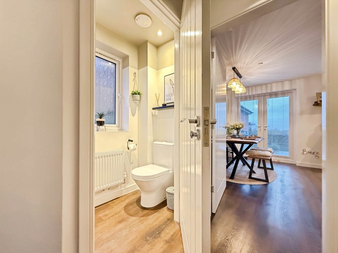 Fitted with a white two piece suite comprising of low level W/C, pedestal wash hand basin, part tiled walls, uPVC double glazed frosted window to side elevation, radiator, laminate flooring.