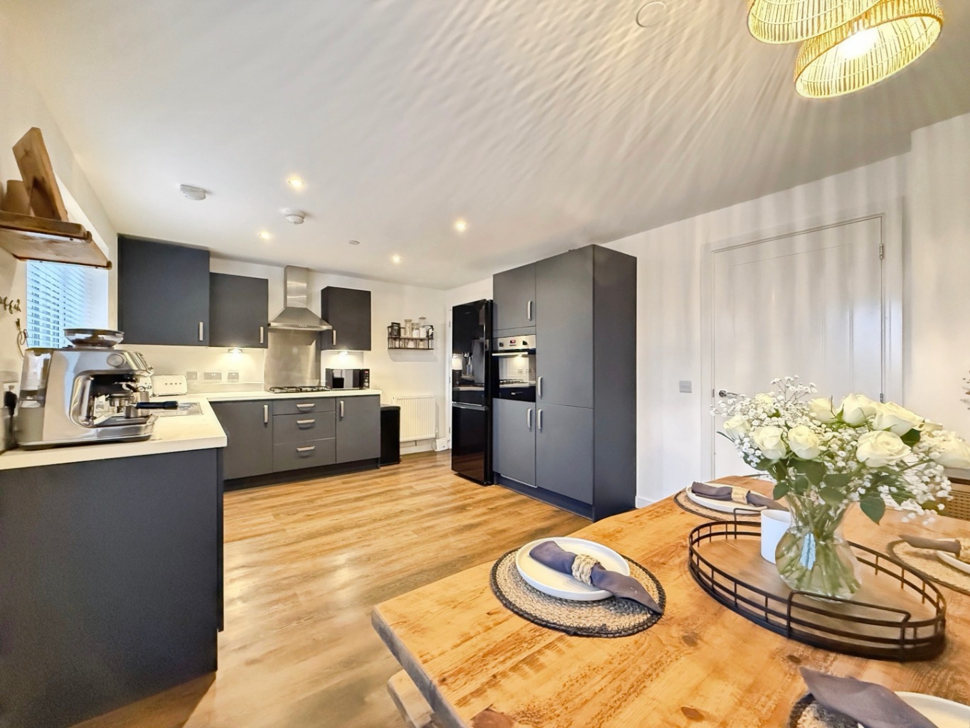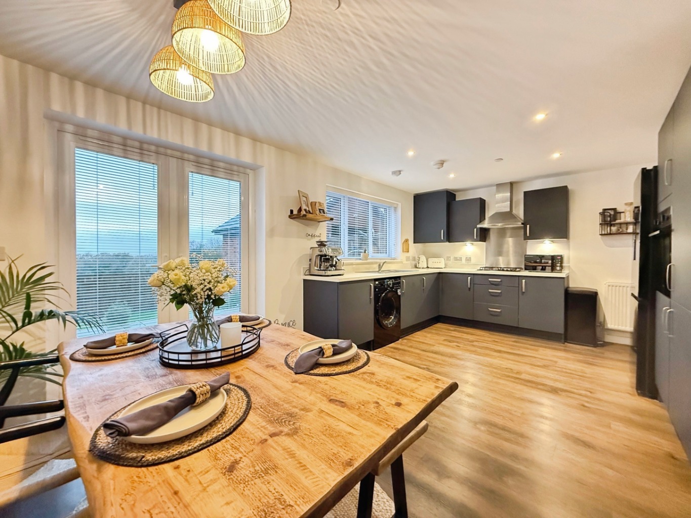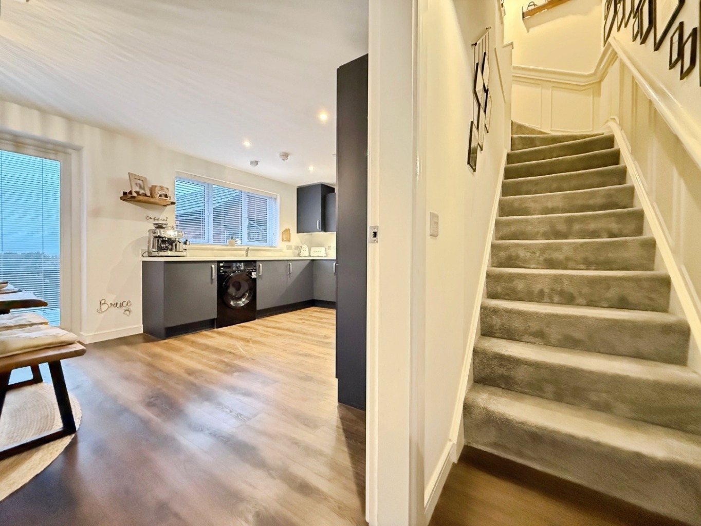 Fitted with a modern range of matching wall and base units in matte navy with complimentary work surface over, 1 1/2 bowl stainless steel sink with mixer tap, integrated washing machine, integrated dishwasher, integrated eye level oven & grill, hob with extractor over, integrated fridge/freezer, spotlights to ceiling, under stairs storage cupboard, uPVC double glazed patio doors and window to rear elevation, radiator, wooden style flooring.