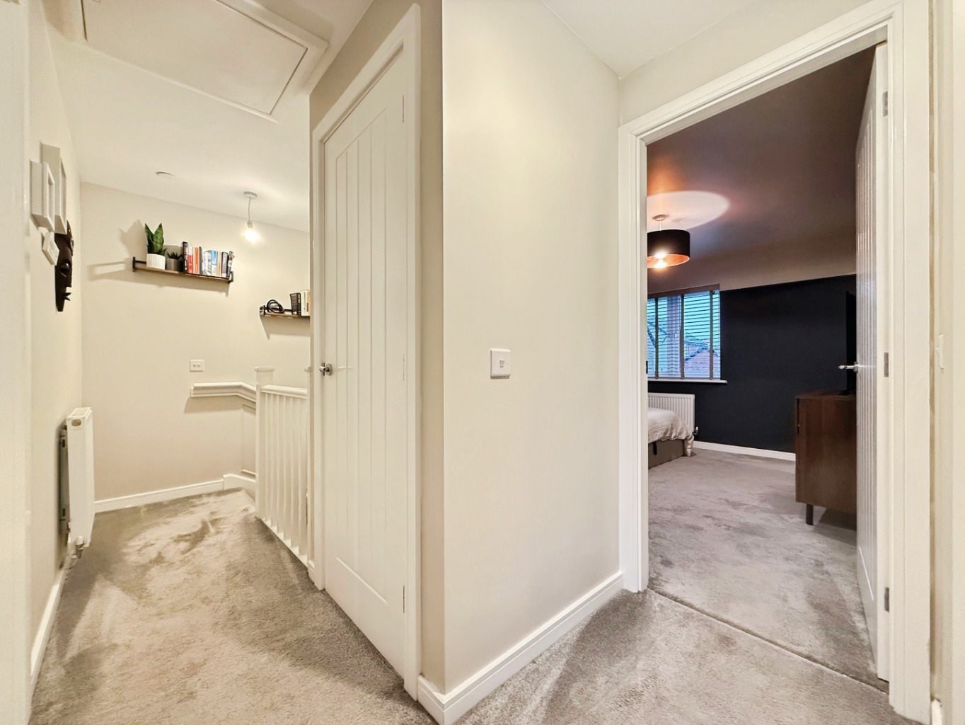 Carpeted underfoot, loft access, storage cupboard, doors into: