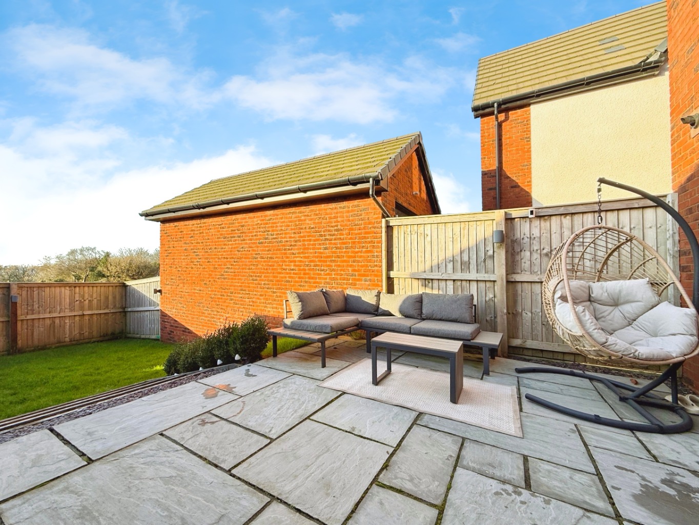 To the front of the property there is a large driveway to the left hand side with detached single garage with power and lighting, gated side access to rear garden. The south/west facing rear garden has been landscaped beautifully to provide a low maintenance area with patio, lawn, decorative stone pathway area leading to summerhouse.