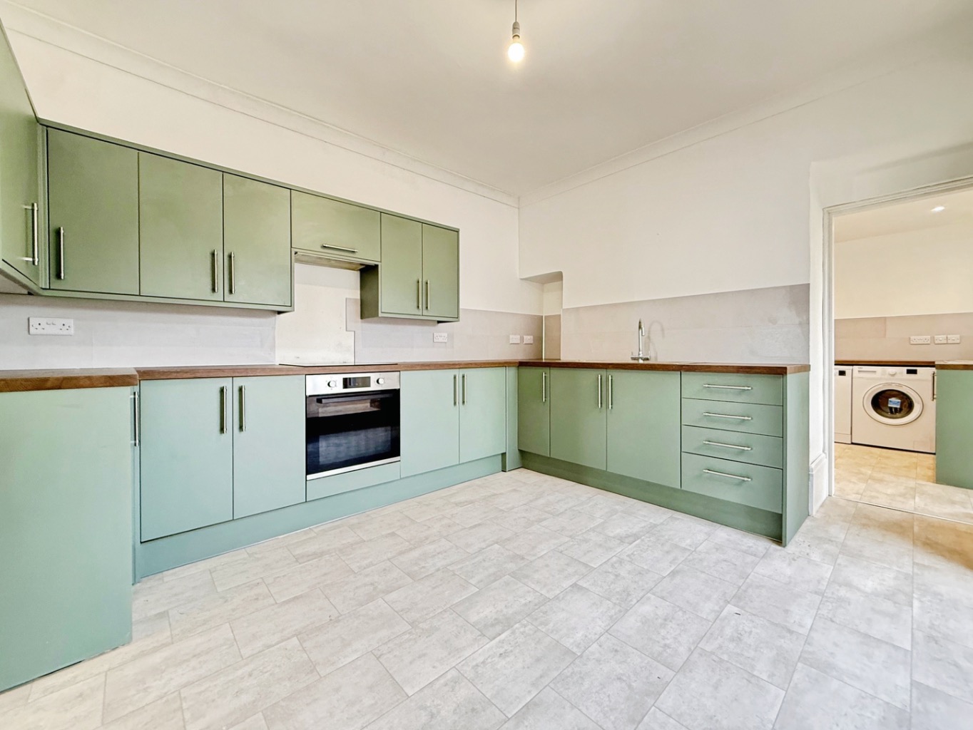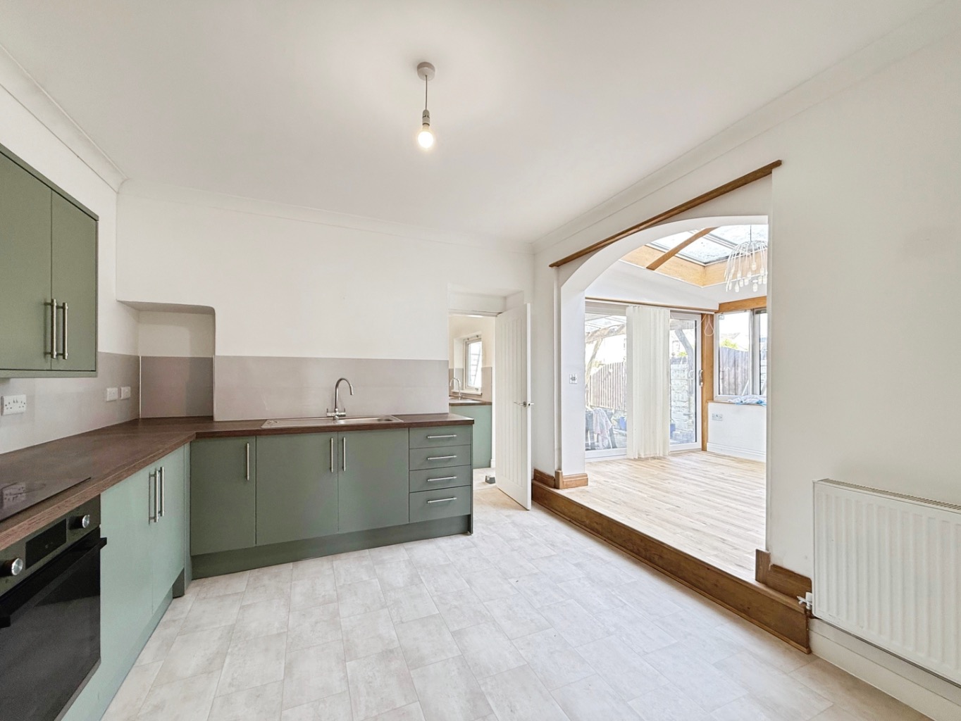 Fitted with a modern range of matching wall and base units with complimentary work surface over, stainless steel sink with mixer tap, induction hob with integrated oven, wood effect flooring, radiator, storage cupboard, opening into: