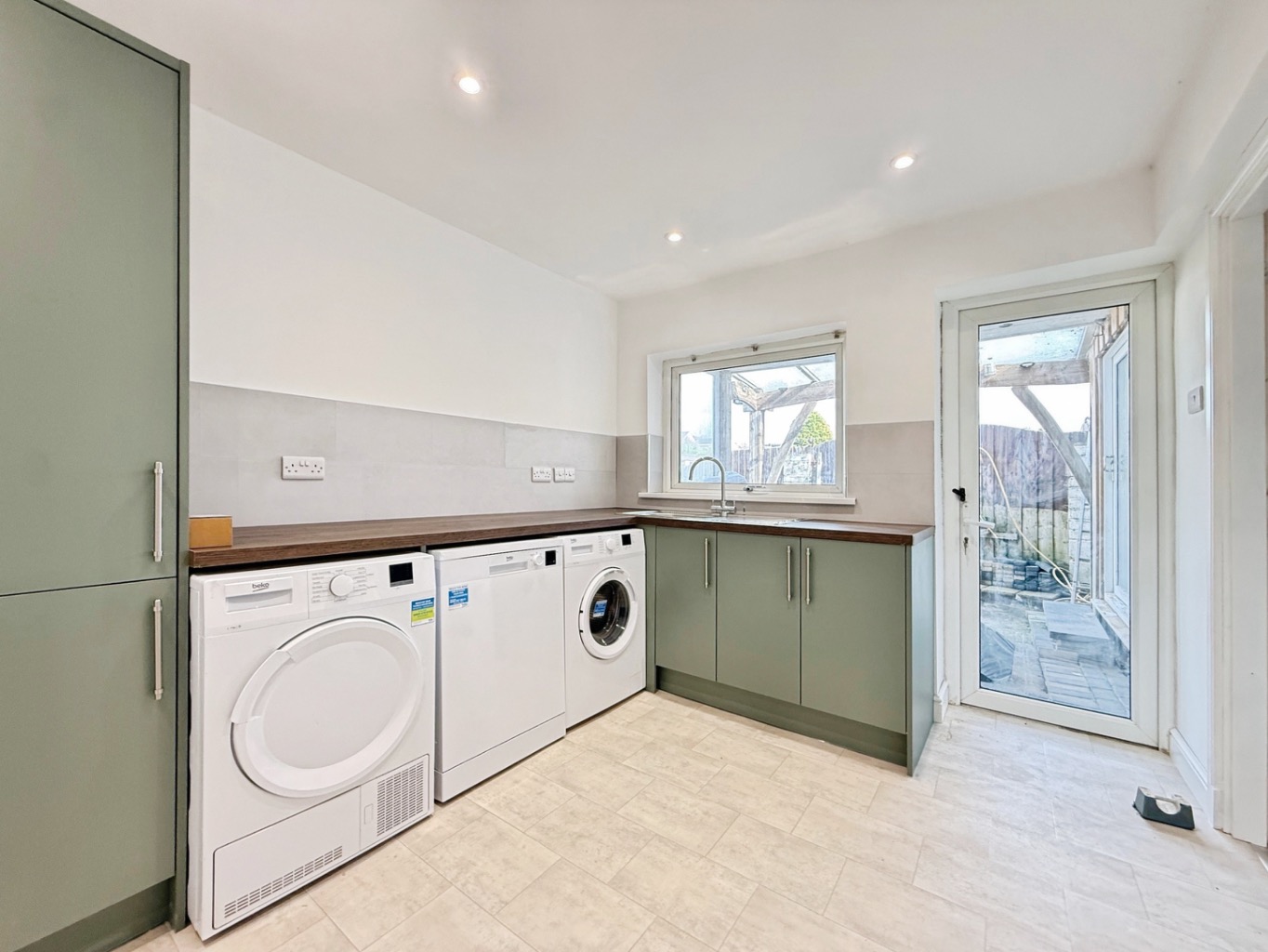 Fitted with a range of base units In tall unit, space for freestanding washing machine, tumble dryer and dishwasher, stainless steel sink with mixer tap, wood effect flooring, spotlights to ceiling, uPVC double glazed window and door to side elevation.