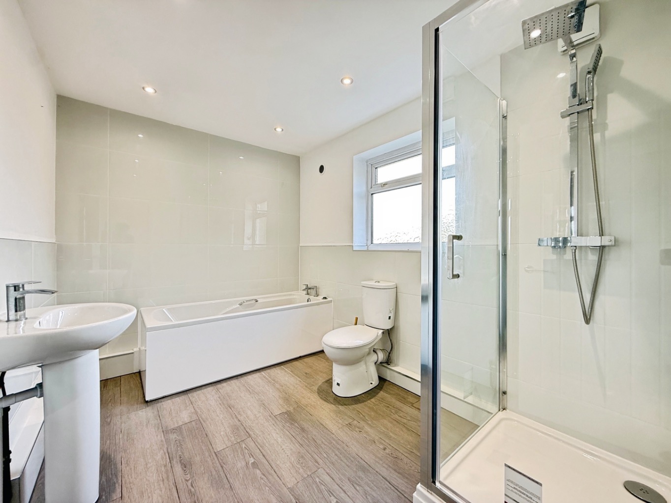 Fitted with a white four piece suite comprising of W/C, pedestal wash hand basin, panelled bath, walk in shower enclosure, partly tiled walls, radiator, uPVC double glazed frosted window to side elevation, spotlights to ceiling, wood effect flooring.