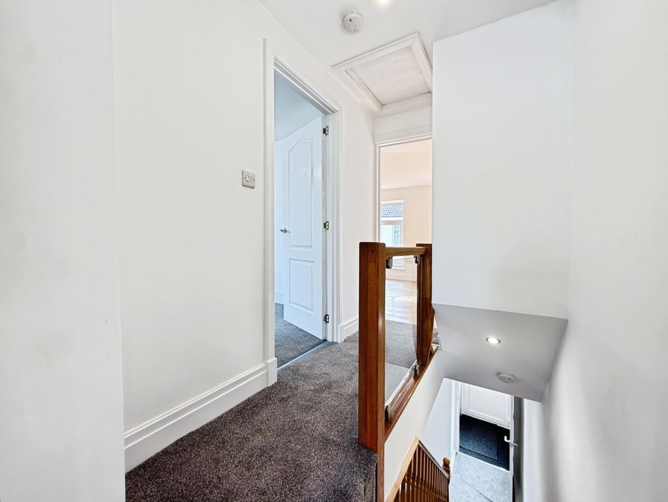 Carpeted underfoot, loft access, glazed balustrade, doors into: