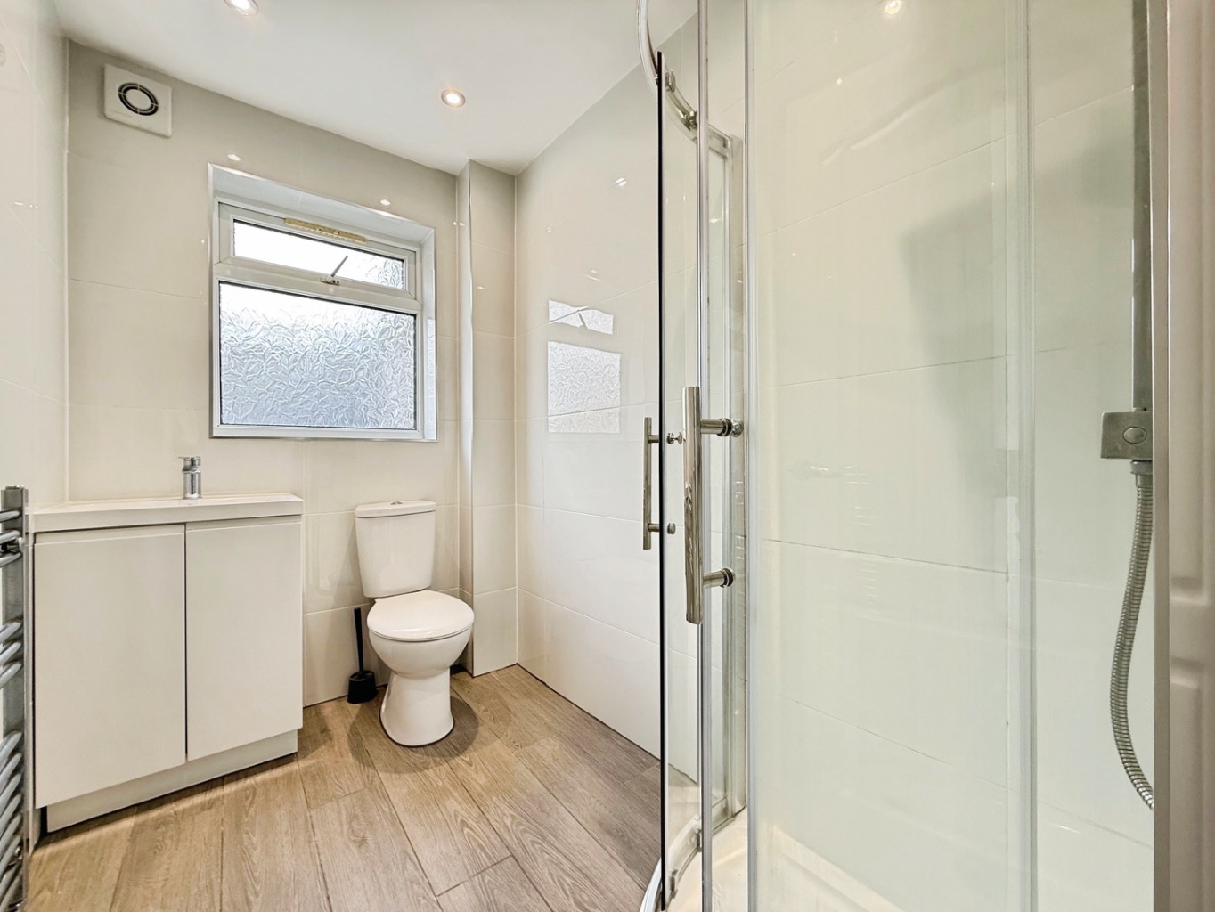Fitted with a white three piece suite comprising of W/C, corner shower enclosure, sink set in vanity unit, polished chrome heated towel rail, partly tiled walls, wood effect flooring, uPVC double glazed frosted window to side elevation.